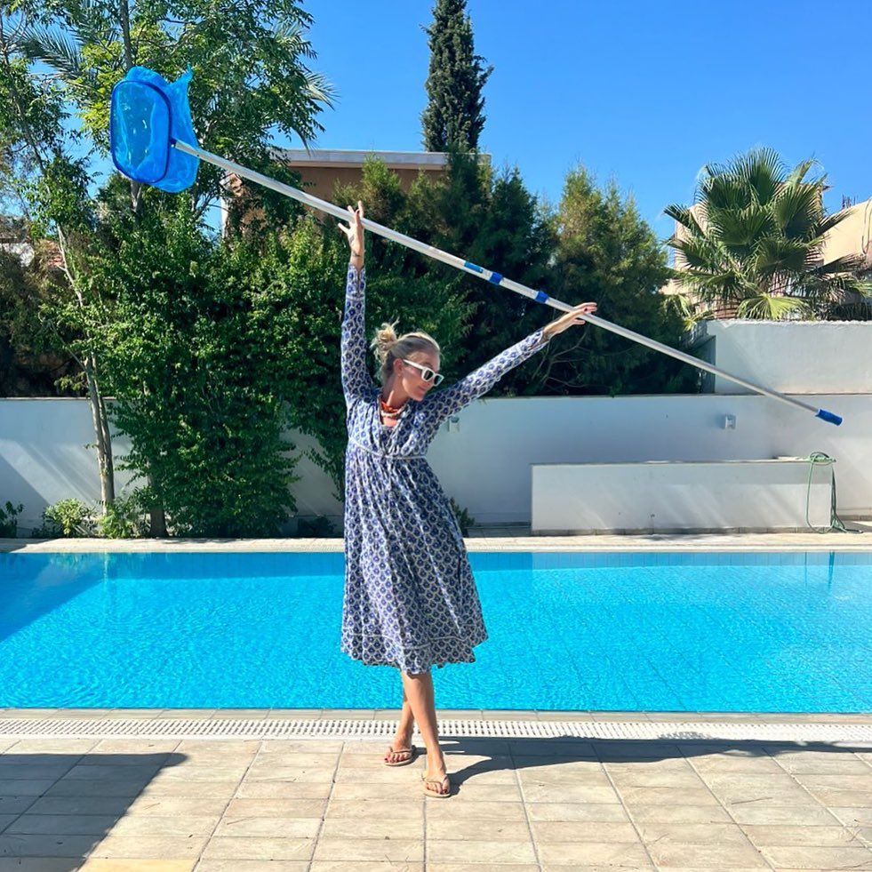 Πιο συγκεκριμένα, η Σύλβια πόζαρε με φόντο της την πισίνα του σπιτιού της και κρατώντας ένα ειδικό δίχτυ καθαρισμού πισίνας και φορώντας ένα summerish αέρινο μίντι printed φόρεμα, σαγιονάρες και λευκά γυαλιά ηλίου μάς εντυπωσίασε.