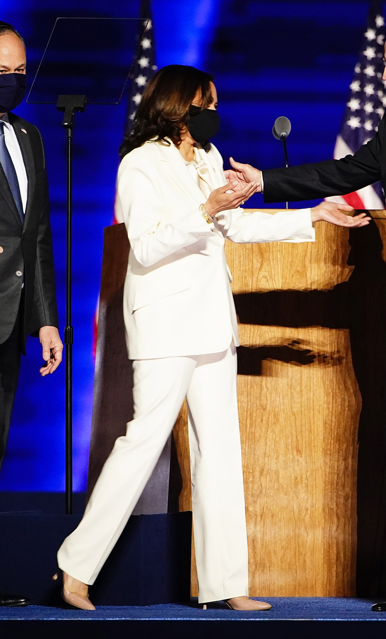Η Kamala, πέραν της δυναμικότητάς της και τα προσόντα που την έφεραν σε αυτή τη θέση, προβλέπεται να κάνει κάθε εμφάνισή της με στυλ και φινέτσα... όπως ακριβώς έκανε και πριν από λίγες μέρες στον ευχαριστήριο λόγο της. Η ίδια φόρεσε ένα κατάλευκο κοστούμι που φέρει την υπογραφή της σχεδιάστριας, Carolina Herrera, το οποίο συνδύασε με ένα σατέν πουκάμισο από μέσα σε μια θερμή απόχρωση απαλού crème. H pussy bow λεπτομέρεια του κομματιού, έκανε την όλη εμφάνισή της ακόμα πιο κομψή και μας άρεσε ιδιαίτερα.