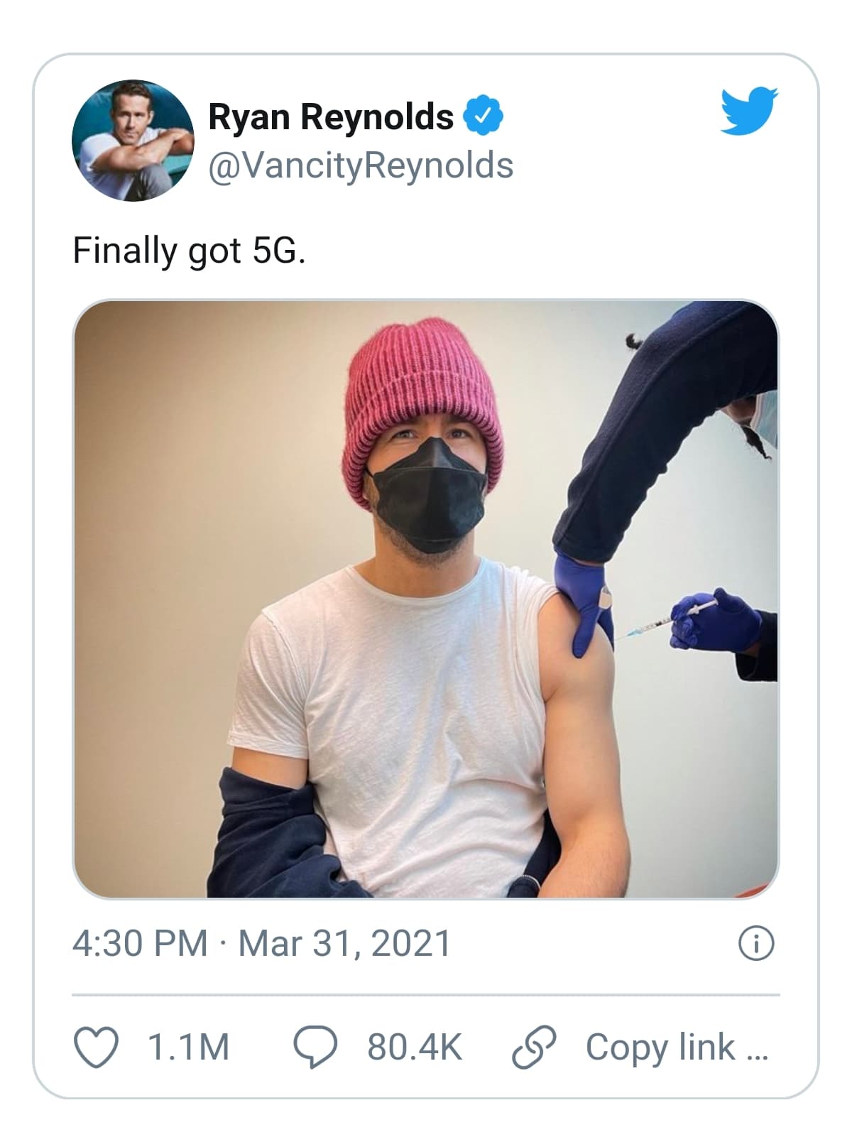 Ο ηθοποιός δημοσίευσε μια φωτογραφία από την στιγμή του εμβολιασμού του στους λογαριασμούς του στα κοινωνικά δίκτυα, και για λεζάντα επέλεξε να τρολάρει μια από τις πολλές συνωμοσίες για τον κορωνοϊό που ακούγονται εδώ και ένα χρόνο. Στην εν λόγω φωτογραφία τον βλέπουμε με την μάσκα του, όσο λαμβάνει το εμβόλιο και στη λεζάντα έγραψε ''Επιτέλους απέκτησα 5G'', με την Vodafone UK να απαντά ''Σε παρακαλώ μην τους δίνεις θάρρος''.