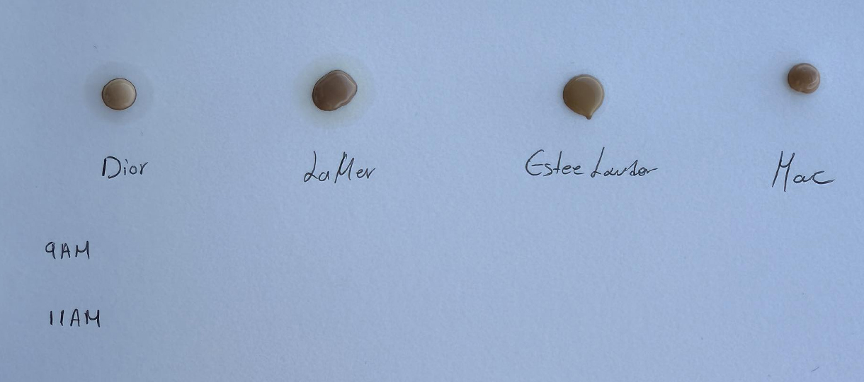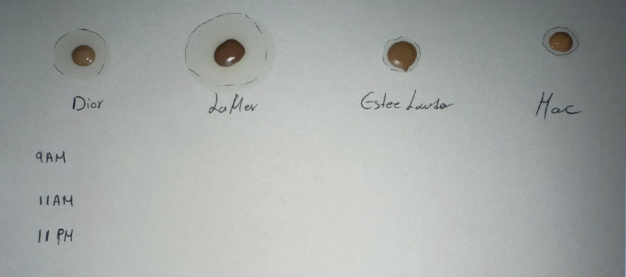 Και για να καταλάβουμε πραγματικά τη διαφορά ανάμεσα σε αυτά τα προϊόντα, κάναμε ένα μικρό πείραμα με κάθε foundation. Μια σταγόνα foundation πάνω σε λευκό χαρτί για 12 ώρες έδειξε ότι το πιο ενυδατικό και “glowy” ήταν το La Mer, ακολουθούμενο από Dior, MAC και τελευταίο, με λιγότερο λάδι, το Estée Lauder Double Wear, εξηγώντας γιατί η διάρκεια του είναι θρυλική.
