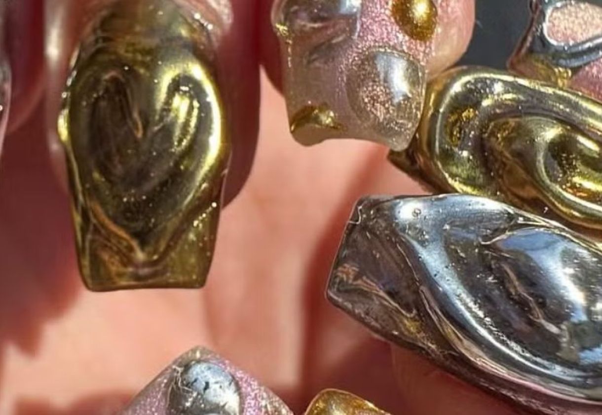 Μπορεί όμως και να μετατραπεί σε απόλυτο statement, με glazed golden chrome, έντονα metallic φινιρίσματα ή molten manis που θυμίζουν λιωμένο μέταλλο σε υγρή μορφή, ένα από τα πιο δυνατά nail trends της χρονιάς.