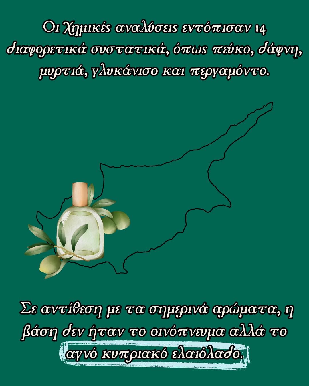 Το 2007, η επιστήμη κατάφερε κάτι σχεδόν ποιητικό, να αναβιώσει τα αρχαία αρώματα. Οι Maria Rosario Belgiorno και Γιαννούλα Λαζάρου δημιούργησαν το «Mystikò», βασισμένο σε αρχαίες συνταγές, χρησιμοποιώντας άγρια φυτά από το Τρόοδος και ελαιόλαδο. Όσοι το δοκίμασαν είπαν το ίδιο, μυρίζει υπέροχα, αλλά είναι έντονο. Όπως ακριβώς και η ιστορία του.