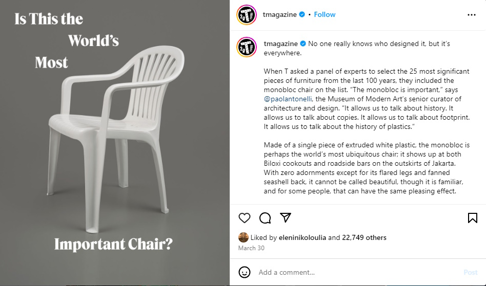 Σε άλλα (σχετικά και πρόσφατα) νέα πάντως, η λευκή πλαστική καρέκλα έχει αναδειχθεί από τους New York Times ως ένα από τα 25 πιο σημαντικά έπιπλα των τελευταίων 100 ετών, σύμφωνα με δημοσίευμα του περιοδικού T-magazine. Συγκεκριμένα, όταν το περιοδικό T ζήτησε από μια ομάδα ειδικών να επιλέξουν τα 25 πιο σημαντικά έπιπλα για τα τελευταία 100 χρόνια, στη λίστα συμπεριέλαβαν και τη λευκή καρέκλα, που είναι φτιαγμένη από πλαστικό μονομπλόκ (διάβασε σχετικά εδώ). Τι να πούμε εμείς όταν έχει μιλήσει η ανώτερη επιμελήτρια αρχιτεκτονικής και σχεδιασμού του Μουσείου Μοντέρνας Τέχνης της Νέας Υόρκης, αναφέροντας ότι «Το μονομπλόκ είναι σημαντικό»!