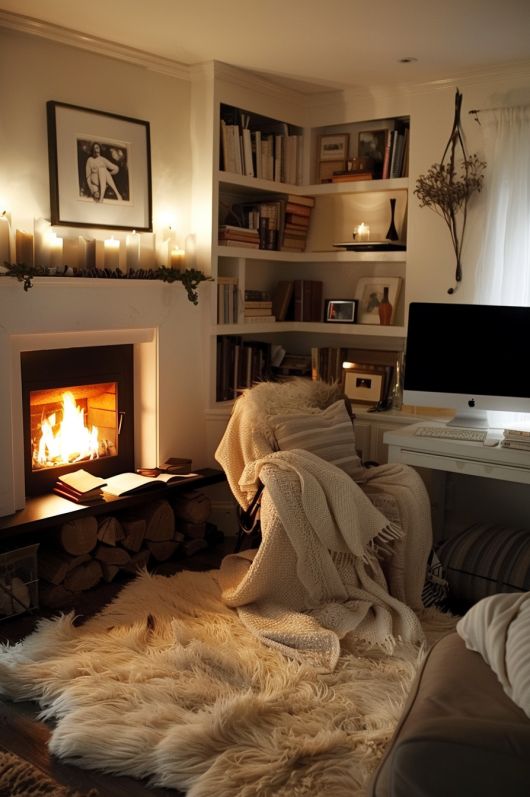 Τέλος, μην ξεχνάτε να διαμορφώσετε μια cozy γωνιά γύρω από το τζάκι. Μαξιλάρες, chunky knitted ριχτάρια, μια soft faux fur κουβέρτα και ένα μικρό βοηθητικό τραπέζι συνθέτουν το απόλυτο reading corner που θα γίνει η αγαπημένη σας συνήθεια τον χειμώνα.