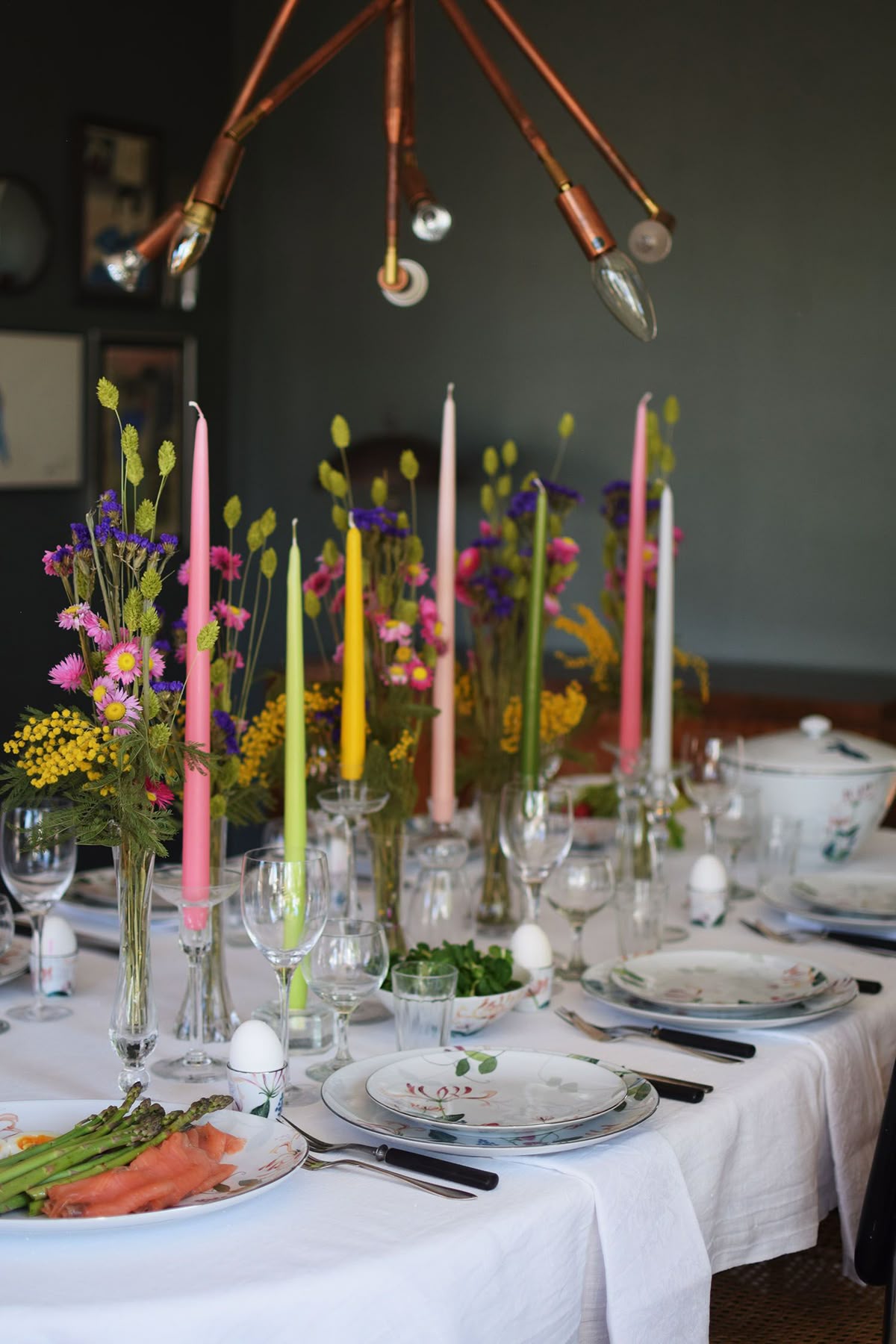 Τα κεριά επιστρέφουν δυναμικά, όχι μόνο για το βράδυ της Ανάστασης αλλά και για το πασχαλινό τραπέζι. Επιλέξτε λευκά ή παστέλ κεριά σε διαφορετικά ύψη για πιο ενδιαφέρον αποτέλεσμα, άλλωστε, δημιουργούν μια ζεστή και cozy αίσθηση που κάνει το τραπέζι πιο φιλόξενο.