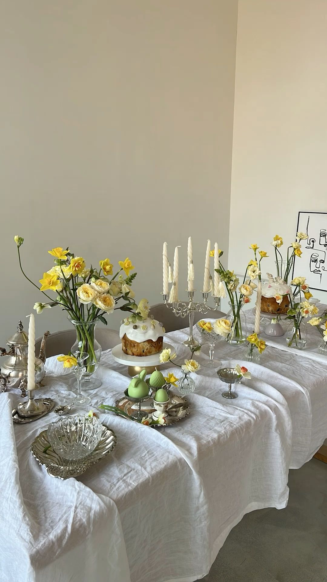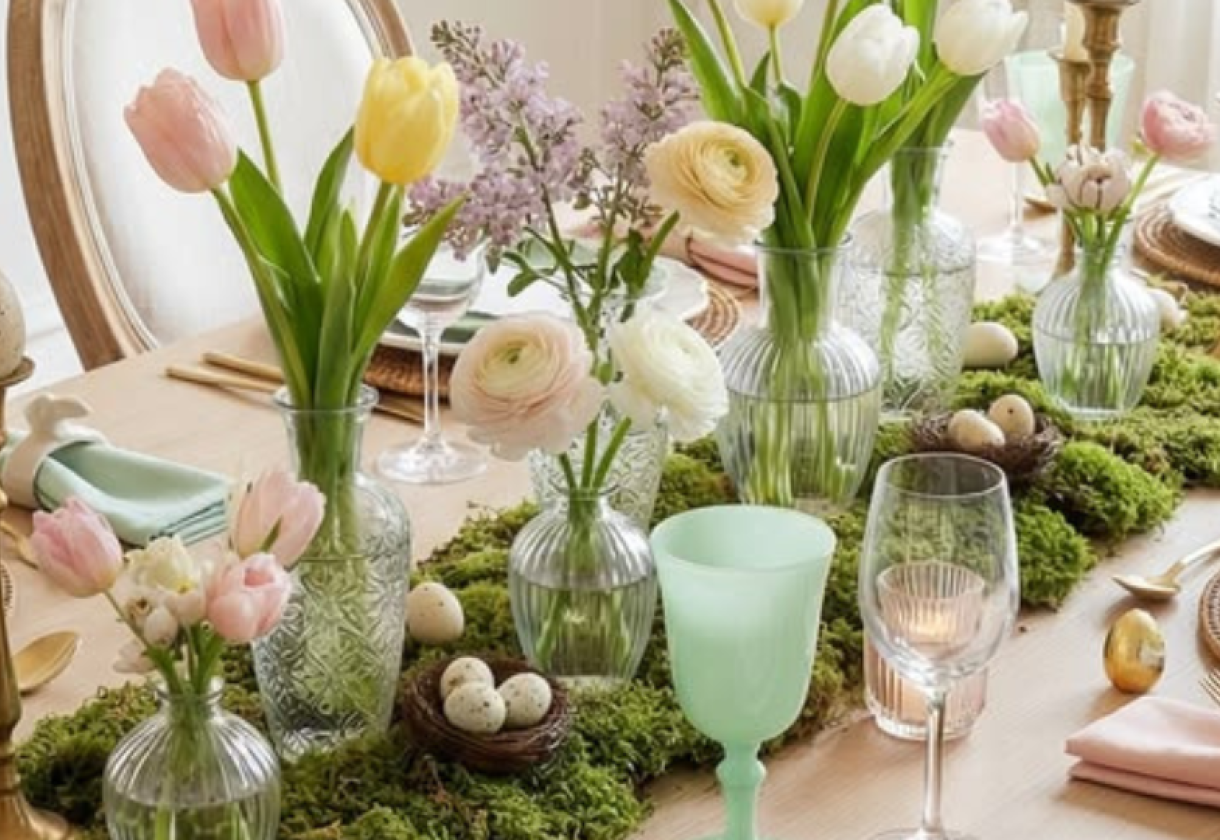 Η άνοιξη «ζητά» λουλούδια και οι interior designers συμφωνούν, όχι όμως υπερβολικά centerpieces. Προτιμήστε μικρά βάζα κατά μήκος του τραπεζιού, αγριολούλουδα ή πασχαλιά και απλές ανθοδέσμες που δεν κρύβουν το οπτικό πεδίο των καλεσμένων. Η φυσικότητα είναι το ζητούμενο φέτος.