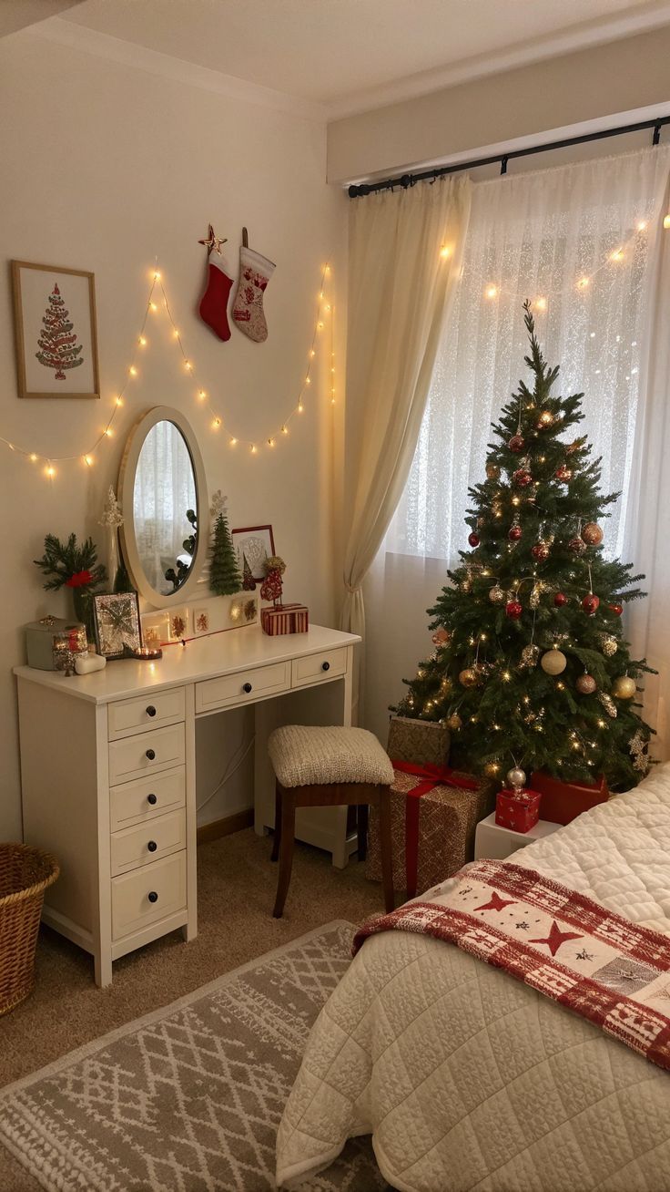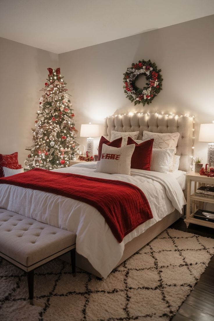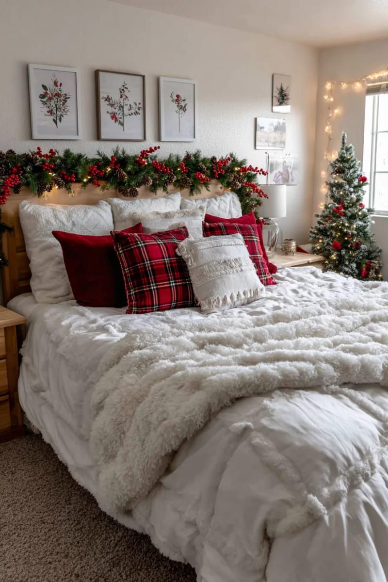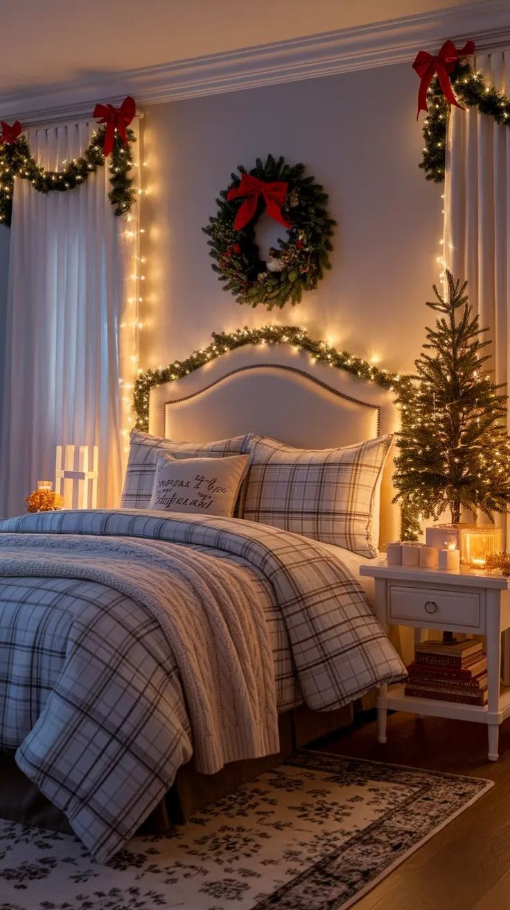 Το υπνοδωμάτιο συχνά μένει εκτός εορταστικής διακόσμησης, αλλά είναι από τους χώρους που αξίζουν λίγη παραπάνω χριστουγεννιάτικη μαγεία. Άλλαξε το κρεβάτι με λευκά είδη σε winter hues όπως βαθύ κόκκινο, forest green ή ακόμα και ένα κλασικό καρό σχέδιο. Πρόσθεσε μια πλεκτή κουβέρτα στο foot of the bed, μικρά tabletop δέντρα στα κομοδίνα, απαλές γιρλάντες φωτός στο κεφαλάρι και αρωματικά κεριά με μυρωδιά gingerbread ή κανέλα. Ένα cozy reading corner με μαξιλάρες μπορεί να γίνει το πιο όμορφο σημείο για βραδινή χαλάρωση.