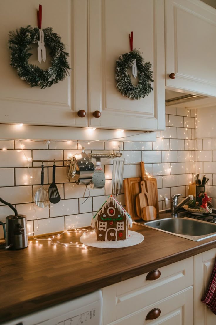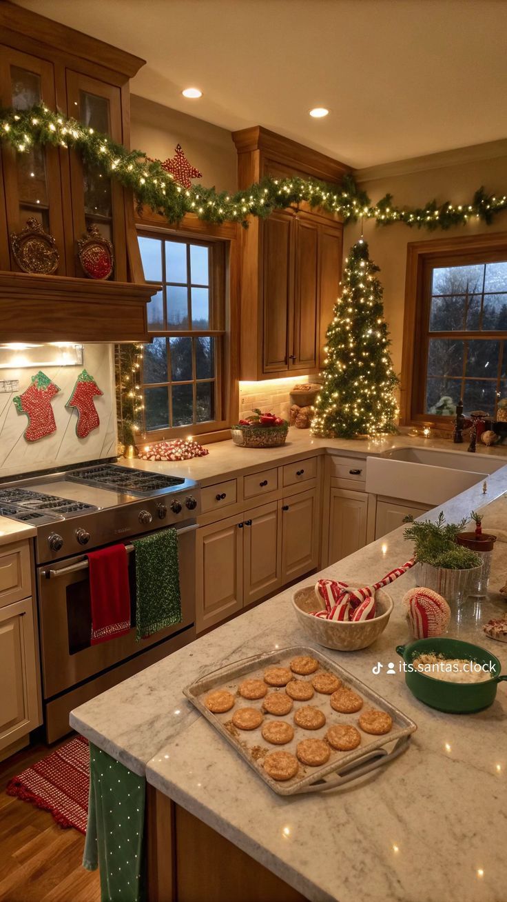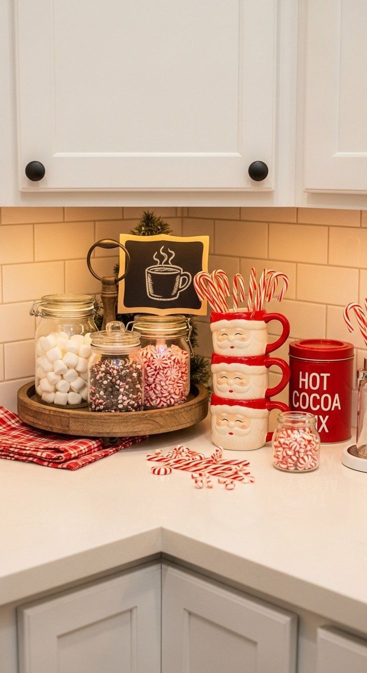 Η κουζίνα μπορεί να γίνει ένας από τους πιο χαριτωμένους χώρους του σπιτιού μέσα στις γιορτές. Δώσε της χριστουγεννιάτικο χαρακτήρα με festive πετσέτες, χριστουγεννιάτικες κούπες, δίσκους και δοχεία μπισκότων σε gingerbread ή snowflake designs. Στόλισε τα ράφια με μικρές γιρλάντες, κρεμαστά στολίδια ή μικρές διακοσμητικές φιγούρες. Δημιούργησε ένα «Hot Cocoa Station» με κακάο, marshmallows, candy canes και χρωματιστές σκόνες. Ένα gingerbread house ή μικρά biscuits σε κουτιά θα δώσουν ακόμη πιο playful διάθεση.