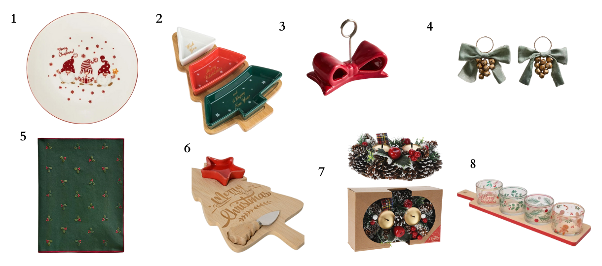 Τα πορσελάνινα πιάτα με φιγούρες gnome δίνουν παιχνιδιάρικη, χαρούμενη νότα στο στρώσιμο, ενώ τα κεραμικά μπολ σε μπαμπού βάση σε σχήμα δέντρου είναι ιδανικά για ξηρούς καρπούς, γλυκά ή μικρά festive finger foods. Tα place card holders με χριστουγεννιάτικους φιόγκους και τα napkin rings με sleigh bells προσθέτουν κομψότητα.