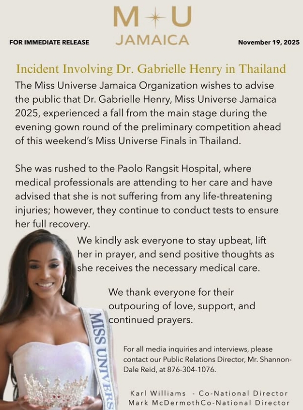 Αντίστοιχα, η οργάνωση Miss Universe Jamaica επιβεβαίωσε ότι η Γκαμπριέλ Χένρι νοσηλεύεται στο νοσοκομείο Paolo Rangsit, δεν αντιμετωπίζει τραυματισμό που να απειλεί τη ζωή της, γίνονται εξετάσεις για να διασφαλιστεί η πλήρης ανάρρωσή της.