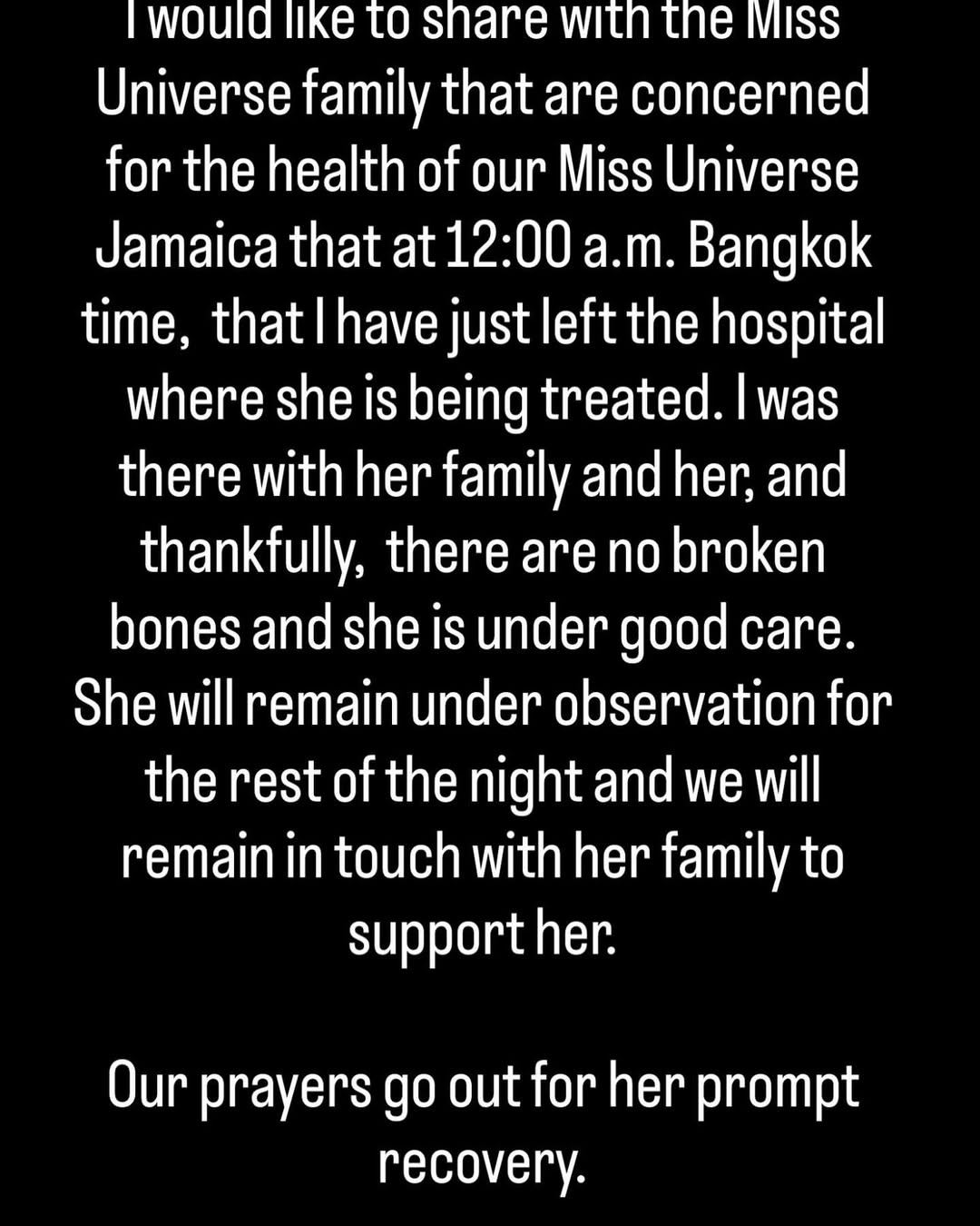 Ο επικεφαλής του Miss Universe έσπευσε να ενημερώσει μέσω Instagram, καθησυχάζοντας το κοινό: ««Θα ήθελα να ενημερώσω την οικογένεια του διαγωνισμού Miss Universe, που ανησυχεί για την υγεία της Μις Τζαμάικα, ότι στις 12:00 π.μ. ώρα Μπανγκόκ, μόλις έφυγα από το νοσοκομείο όπου νοσηλεύεται. Ήμουν εκεί μαζί με την οικογένειά της και την ίδια, και ευτυχώς δεν έχει σπασμένα κόκαλα και βρίσκεται υπό καλή φροντίδα».