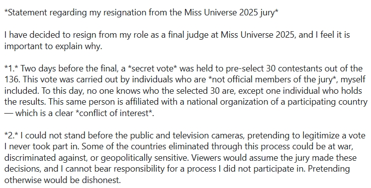 Και όλα αυτά, ενώ η Miss Mexico είχε πρόσφατα έντονη αντιπαράθεση με στέλεχος του Miss Universe, το οποίο την αποκάλεσε «χαζή» με το συγκεκριμένο στέλεχος να απομακρύνεται από τον διαγωνισμό. Μάλιστα, πολλές διαγωνιζόμενες φέρονται να είναι «εξοργισμένες» για την αδιαφάνεια. Και ο διαγωνισμός δεν έχει καν αρχίσει… με το live της 21ης Νοεμβρίου να πλησιάζει, το Miss Universe βρίσκεται υπό το μικροσκόπιο όσο ποτέ. Διαγωνιζόμενες, κριτές και κοινό αναμένουν να δουν πώς θα διαχειριστεί ο οργανισμός την κρίση.