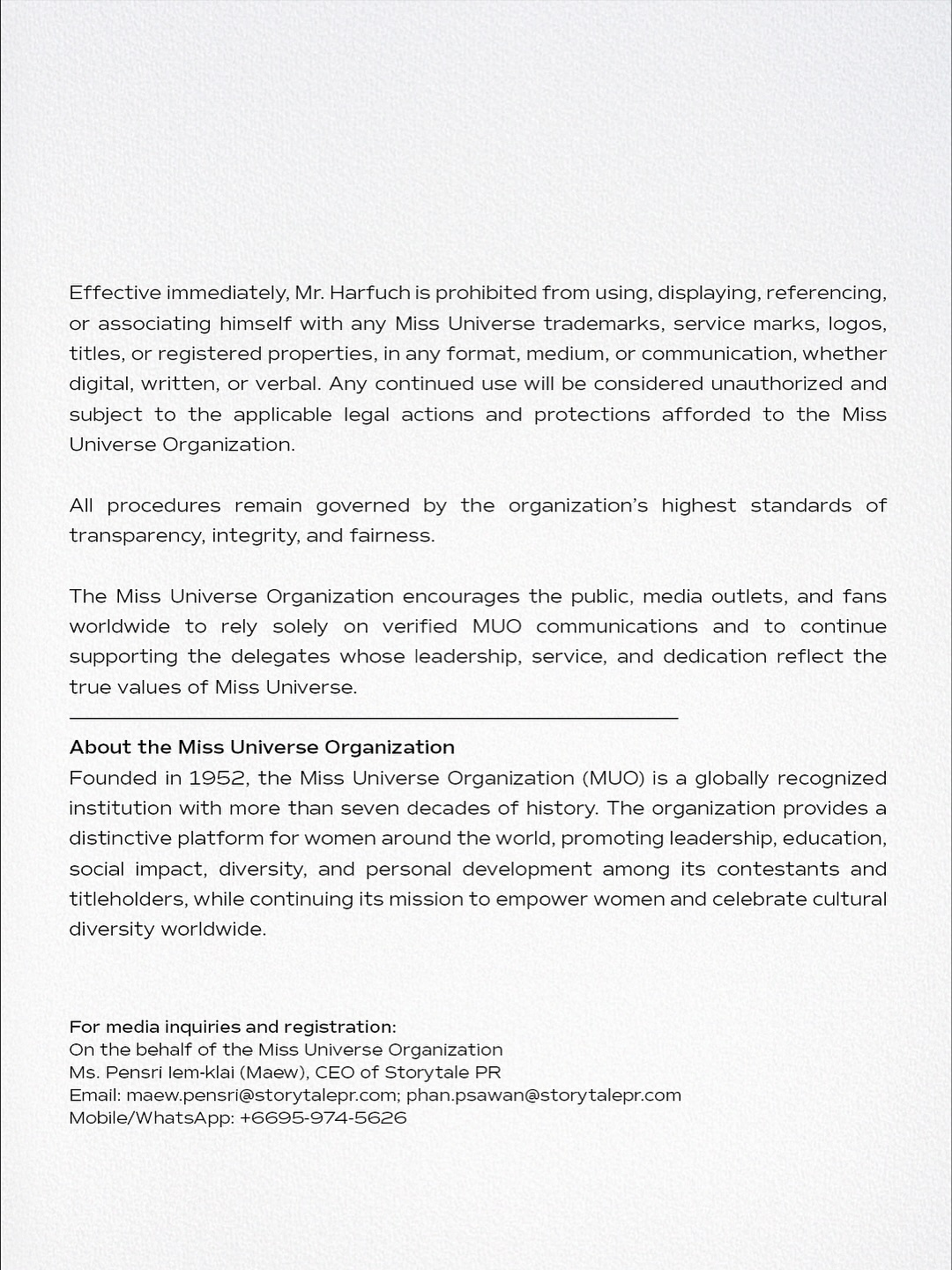 Ο οργανισμός Miss Universe Organization (MUO) αντέδρασε άμεσα, διαψεύδοντας όλους τους ισχυρισμούς: «Δεν δημιουργήθηκε καμία αυτοσχέδια κριτική επιτροπή. Όλες οι διαδικασίες κρίσης ακολουθούν τα επίσημα και εποπτευόμενα πρωτόκολλα». Παράλληλα, απαγόρευσε δημοσίως στον Omar να χρησιμοποιεί οποιοδήποτε σήμα ή brand του Miss Universe.