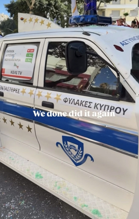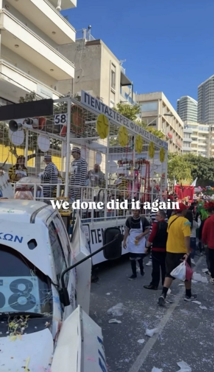 Το σατιρικό άρμα με τίτλο «Οι Πεντάστερες Φυλακές Κύπρου» παρουσίασε μια παιχνιδιάρικη αλλά και αιχμηρή εικόνα για τον τρόπο που ορισμένοι αντιλαμβάνονται την κοινωνική πραγματικότητα. Αντί για τουρίστες που χαλαρώνουν σε ένα all-inclusive resort, το άρμα υποδέχτηκε… «εκλεκτούς» τρόφιμους, σατιρίζοντας με χιούμορ και υπερβολή τον τρόπο που φαντάζεται κάποιος την «πολυτελή» ζωή… ακόμα και μέσα στους τοίχους μιας φυλακής.