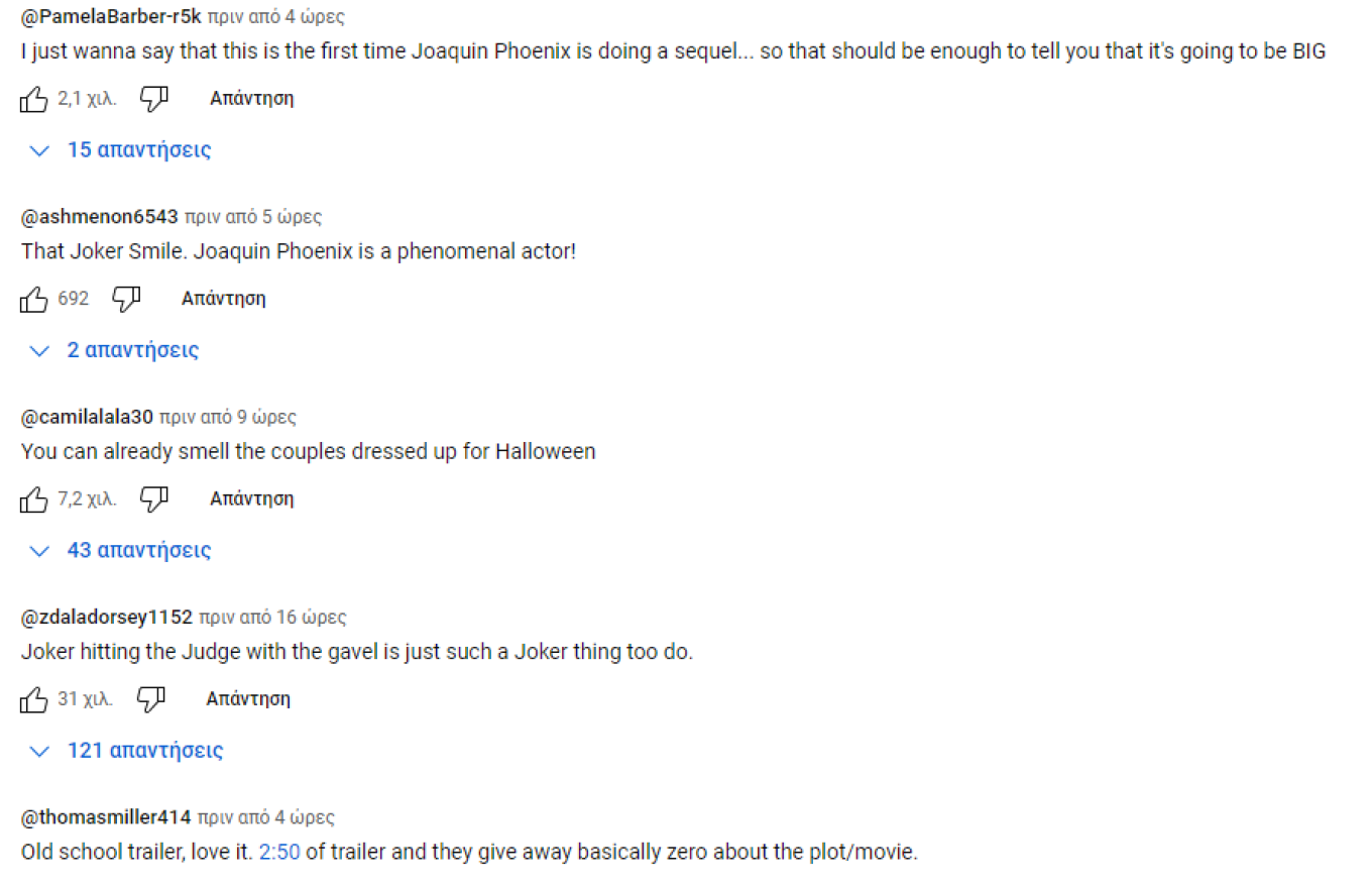 Το κανάλι της Warner Bros. στο YouTube κατακλύστηκε από χιλιάδες σχόλια φαν που εξέφρασαν την ανυπομονησία τους να δουν ξανά το χαρακτηριστικό χαμόγελο του Φoίνιξ. Ένας χρήστης έγραψε, «Αυτό το χαμόγελο... είναι ανησυχητικό το πόσο καλός είναι στον ρόλο», ενώ άλλος πρόσθεσε, «Πώς το κάνει;». Η επιστροφή του Φίνιξ στον ρόλο του Joker κατάφερε να εντυπωσιάσει ακόμη και μέσα από τα περιορισμένα πλάνα του τρέιλερ.