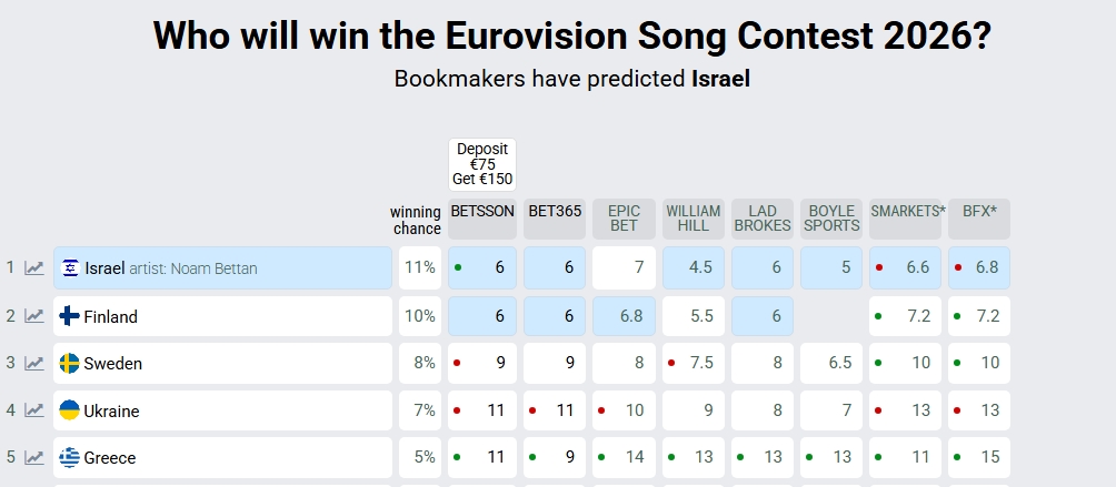 Την ίδια στιγμή, η Eurovision 2026 συνεχίζει να «κλείνει» το παζλ των συμμετοχών. Η Ελβετία ανακοίνωσε πως θα εκπροσωπηθεί από τη Veronica Fusaro, με το τραγούδι της να είναι το τελευταίο που θα αποκαλυφθεί επίσημα, στις 11 Μαρτίου. Στο μέτωπο των στοιχημάτων, η Ελλάδα φιγουράρει αυτή τη στιγμή στην 5η θέση, δείχνοντας δυναμική, ενώ η Κύπρος βρίσκεται στην 23η θέση, με αρκετό δρόμο ακόμη μέχρι την τελική διαμόρφωση των αποδόσεων.
