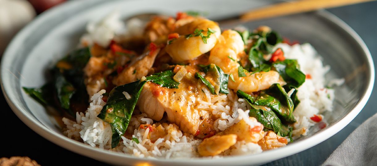 Κάρυ με κομμάτια ψάρι και γαρίδες