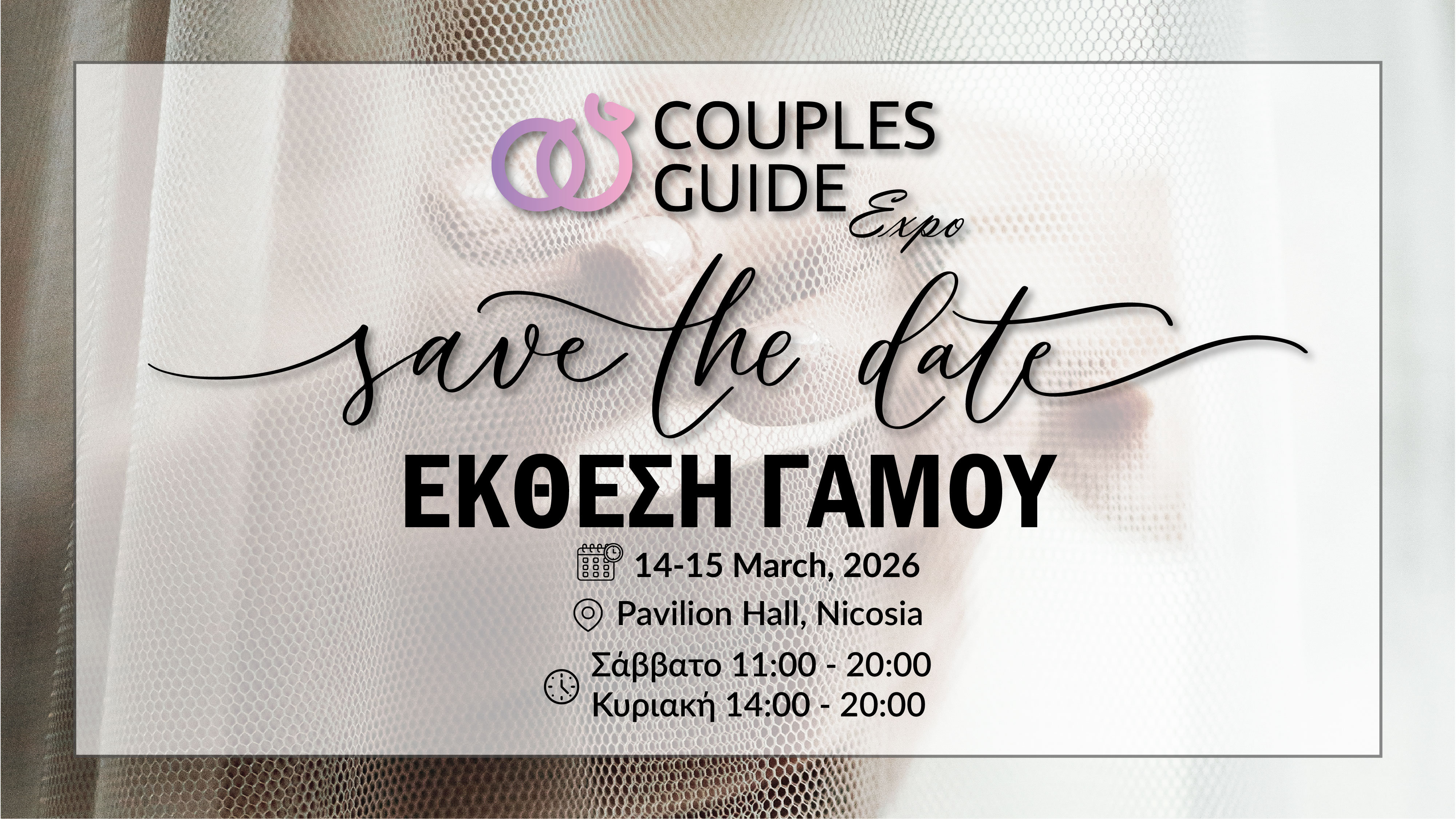 Η Couples Guide App φέρνει την COUPLES GUIDE EXPO – Έκθεση Γάμου, το Σαββατοκύριακο 14 & 15 Μαρτίου 2026, στο Pavilion Hall στη Λευκωσία, συγκεντρώνοντας σε έναν χώρο τους κορυφαίους επαγγελματίες γάμου της Κύπρου και δίνοντας στα ζευγάρια τη δυνατότητα άμεσης και ουσιαστικής επικοινωνίας μαζί τους.