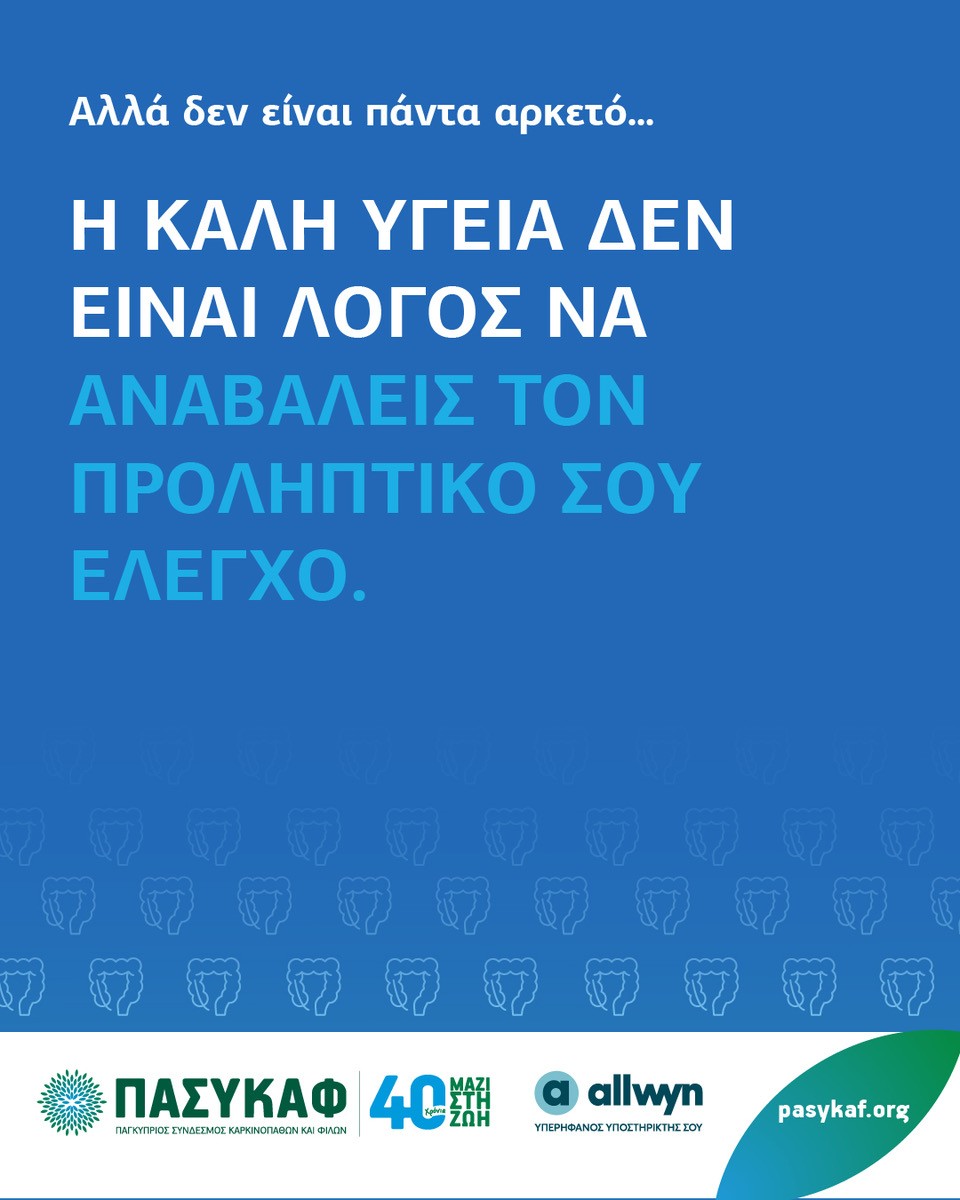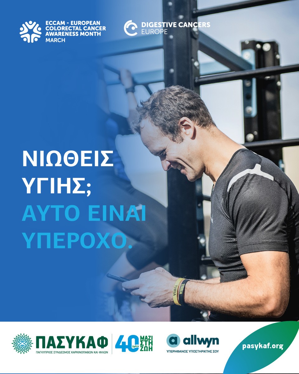 Ο ΠΑΣΥΚΑΦ, που φέτος ολοκληρώνει 40 χρόνια συνεχούς προσφοράς στην πρόληψη και στην αντιμετώπιση του καρκίνου, τιμά τον Παγκόσμιο Μήνα Καρκίνου του Παχέος Εντέρου πραγματοποιώντας παγκύπρια εκστρατεία ευαισθητοποίησης. Η εκστρατεία τελεί υπό την αιγίδα του Υπουργείου Υγείας και πραγματοποιείται σε συνεργασία με τη Γαστρεντερολογική Εταιρεία Κύπρου και την Ογκολογική Εταιρεία Κύπρου, ενώ υπερήφανος υποστηρικτής είναι η Allwyn. Ο ΠΑΣΥΚΑΦ είναι μέλος του DiCE – Digestive Cancers Europe, συμβάλλοντας ενεργά σε ευρωπαϊκές πρωτοβουλίες για την πρόληψη και αντιμετώπιση των καρκίνων του πεπτικού. Την εκστρατεία συνθέτει και υλοποιεί η Διεύθυνση Πρόληψης και Κοινωνικού Marketing του ΠΑΣΥΚΑΦ, ενώ η πρώτη παγκύπρια εκστρατεία για τον καρκίνο του παχέος εντέρου πραγματοποιήθηκε από τον ΠΑΣΥΚΑΦ το 2006 και συνεχίζεται έκτοτε κάθε χρόνο με συνέπεια.