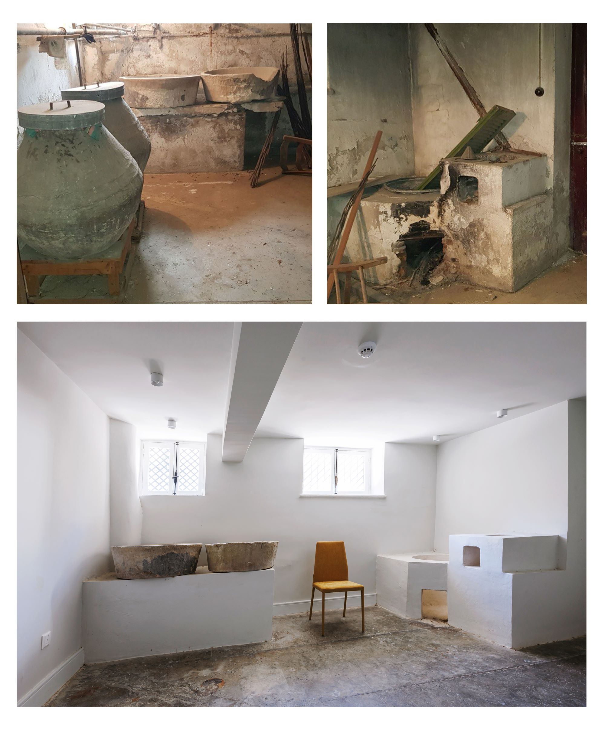 Εκεί βρίσκονταν τα βοηθητικά δωμάτια, το μαειρκό όπου βράζονταν καζάνια, οι λεκάνες όπου γίνονταν τα χαλλούμια, οι αποθήκες με τα πυθάρια και τις λαμιντζάνες. Το :legacy διατηρεί ακόμη τα ίχνη αυτής της ζωής, σχεδόν σαν μια γέφυρα ανάμεσα στο παλιό και το νέο.