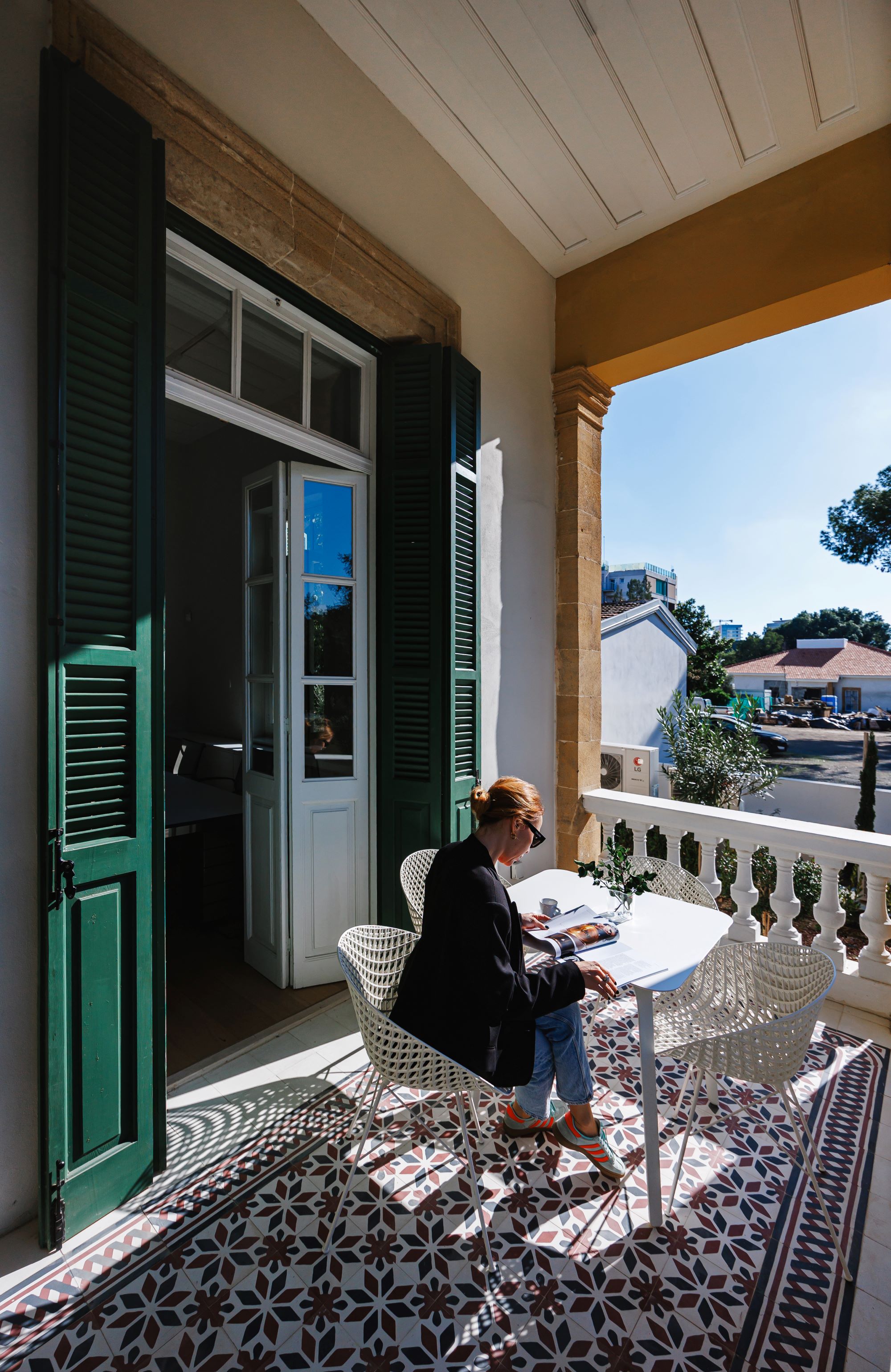 Τα παραθυρόφυλλα ήταν αρχικά πράσινα, ενώ η εξώπορτα… βυσσινί. «Τώρα τη βάψαμε πράσινη, πιο κοντά στο νέο ύφος του κτηρίου και σε αρμονία με τα χρώματα που επικρατούν στον εξωτερικό χώρο», σημειώνει ο Παναγίδης. Στην αυλή, η τερατσιά και οι ελιές είναι αιωνόβια δέντρα. «Προσθέσαμε μόνο αστικά κυπριακά φυτά για να διατηρήσουμε την αυθεντικότητα του χώρου», συμπληρώνει.