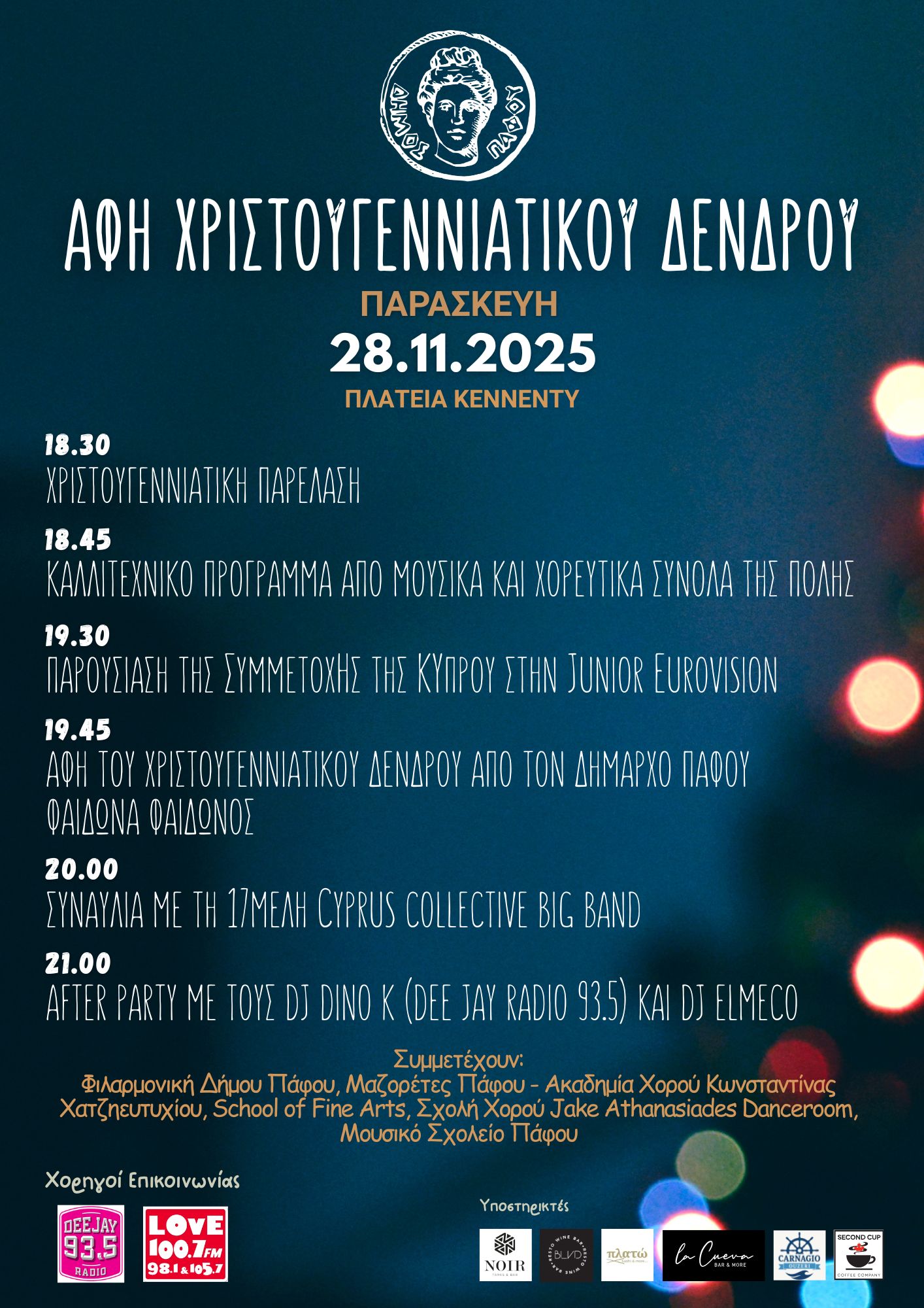 Με την καθιερωμένη Αφή του Χριστουγεννιάτικου Δένδρου, που σηματοδοτεί την έναρξη των εορταστικών εκδηλώσεων στην πόλη, η Πάφος υποδέχεται την πιο φωτεινή εποχή του χρόνου, την ερχόμενη Παρασκευή 28 Νοεμβρίου, στην Πλατεία Κέννεντυ, στο πλαίσιο μιας πλούσιας εκδήλωσης που θα αρχίσει στις 6.30 μ.μ..
