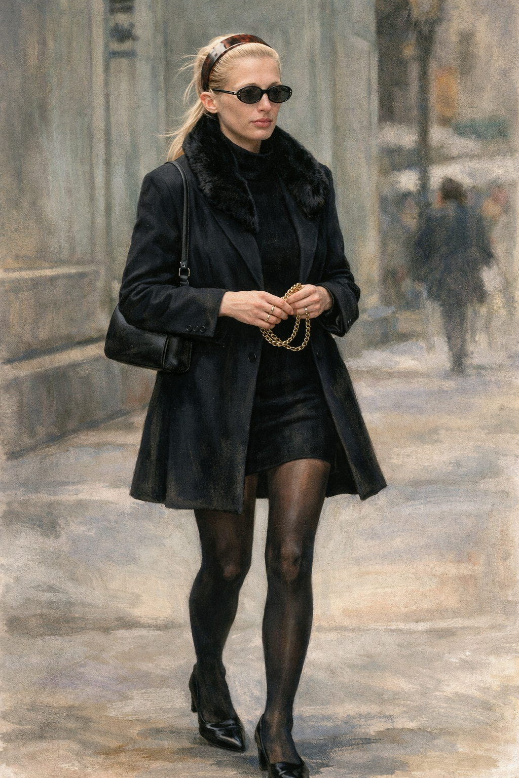 Κεντρικό ρόλο στη γκαρνταρόμπα της είχαν πάντα τα structured πανωφόρια. Ένα καλοραμμένο παλτό ή ένα δερμάτινο trench δεν ήταν απλώς πρακτικά κομμάτια, αλλά αυτά που έδιναν χαρακτήρα σε ολόκληρο το outfit. Η σιλουέτα έπρεπε να είναι καθαρή, σχεδόν αρχιτεκτονική, χωρίς τίποτα περιττό.