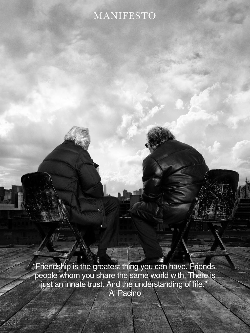 Στο συνοδευτικό βίντεο, ο Robert De Niro λέει: «Η ζεστασιά δεν έχει να κάνει με το έξω», ενώ ο Al Pacino συμπληρώνει: «Η φιλία είναι το πιο σπουδαίο πράγμα που μπορεί να έχει κανείς». Οι δύο τους φορούν κομμάτια από τη Fall/Winter 2025 collection της Moncler, όπως το εμβληματικό Maya 70 jacket. Το βίντεο πλαισιώνεται από μια νέα εκτέλεση του κλασικού “Lean on Me” του Bill Withers, ερμηνευμένη από τους Tobe και Fat Nwigwe, που δένει ιδανικά με το μήνυμα της καμπάνιας.