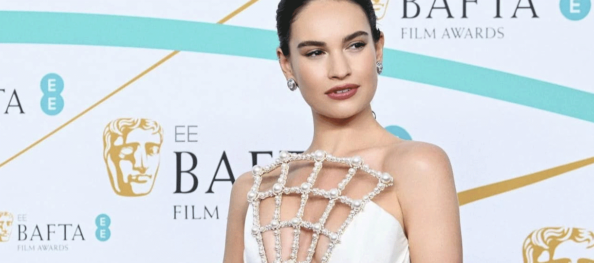 Στα λευκά εμφανίστηκε και η Lily James, επιλέγοντας να φόρεσε μία τουαλέτα από μετάξι της σχεδιάστριας Tamara Ralph από τον οίκο Ralph & Russo. Τα δυο στοιχεία που έκαναν αυτό το φόρεμα τόσο ενδιαφέρον ήταν η δραματική λεπτομέρεια αράχνης στο μπούστο και ο τεράστιος φιόγκο στην πλάτη. Η ηθοποιός ολοκλήρωσε την εμφάνισή της με ένα ζευγάρι διακριτικά σκουλαρίκια.
