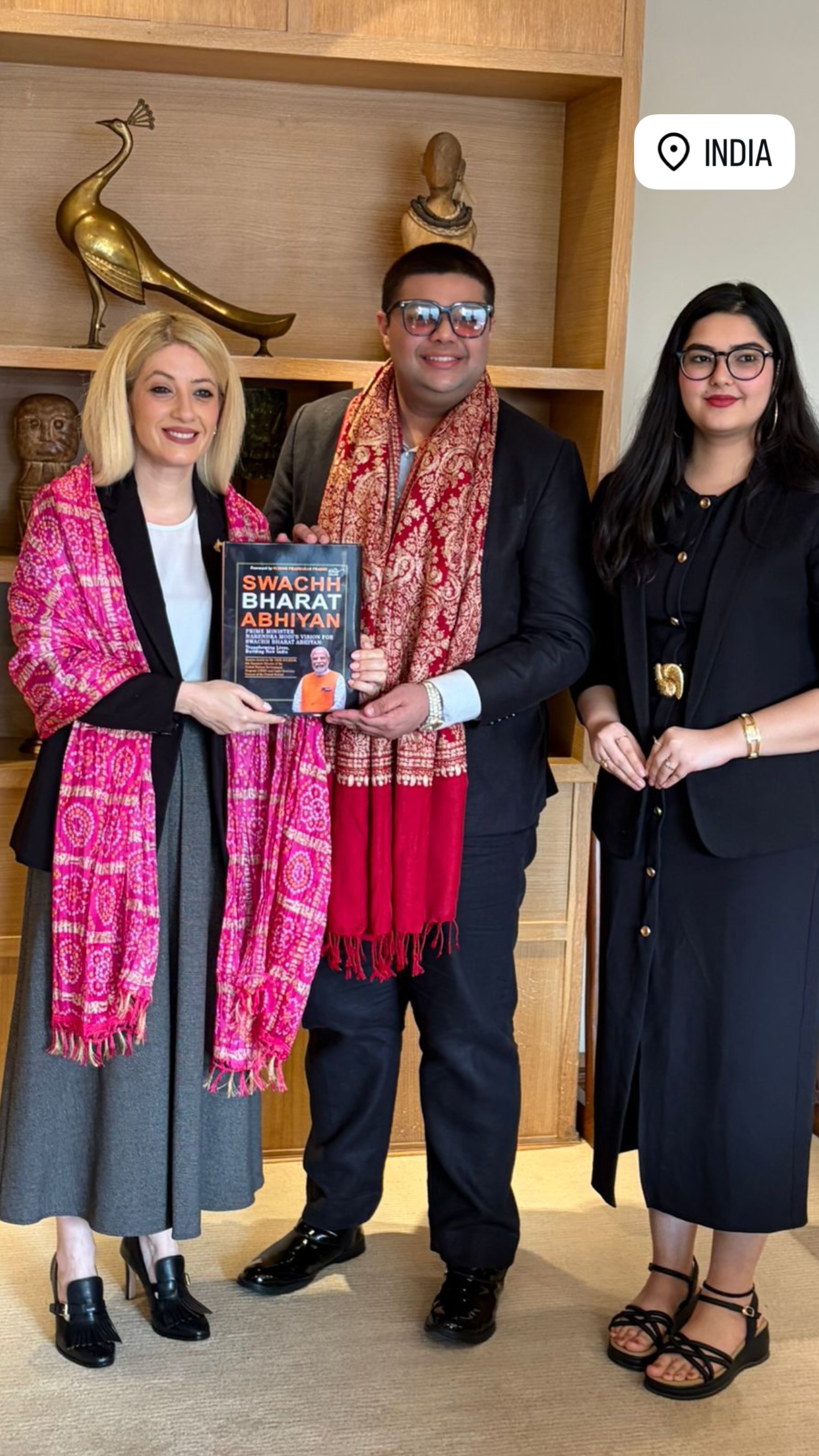 Σε μια ιδιαίτερα ζεστή και τιμητική χειρονομία, η Πρόεδρος της Βουλής Αννίτα Δημητρίου εμφανίστηκε με παραδοσιακό ινδικό μαντήλι (shawl) στο πλαίσιο της επίσημης επίσκεψής της στην Ινδία. Η εικόνα αποτυπώνει τη σημασία της πολιτιστικής ανταλλαγής και του σεβασμού προς τα έθιμα της χώρας υποδοχής, με την ίδια να κρατά στα χέρια της και ένα βιβλίο που της προσφέρθηκε ως δώρο κατά τη συνάντηση.