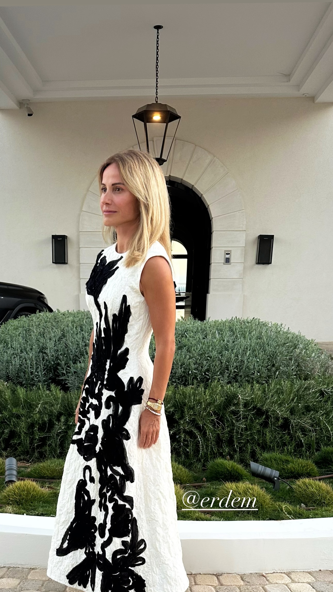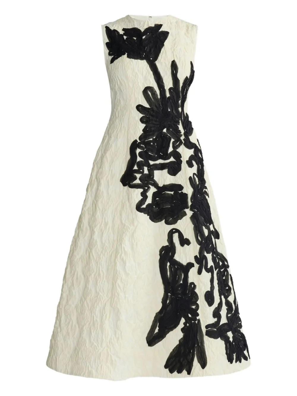 Η Έμιλυ επέλεξε ένα midi λευκό φόρεμα χωρίς μανίκια, με φλοράλ απλικέ σχέδιο σε μαύρη απόχρωση, το οποίο αναδείκνυε τη φινετσάτη αισθητική της. Το φόρεμα είναι δημιουργία του Erdem Moralioglu, ο οποίος για τη συλλογή Φθινόπωρο ’25 συνεργάστηκε με τη Βρετανίδα ζωγράφο Kaye Donachie, προσδίδοντας μια καλλιτεχνική διάσταση στα ρούχα του.