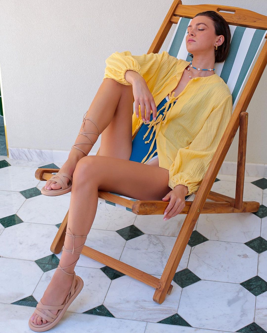 Το μοντέλο φόρεσε ένα ολόσωμο μαγιό σε πετρόλ-μπλε χρώμα, το οποίο συνδύασε με ένα κίτρινο λινό πουκάμισο, που το χαρακτήριζαν τα ιδιαίτερα ballon μανίκια του και το δέσιμο στο μπροστινό μέρος.