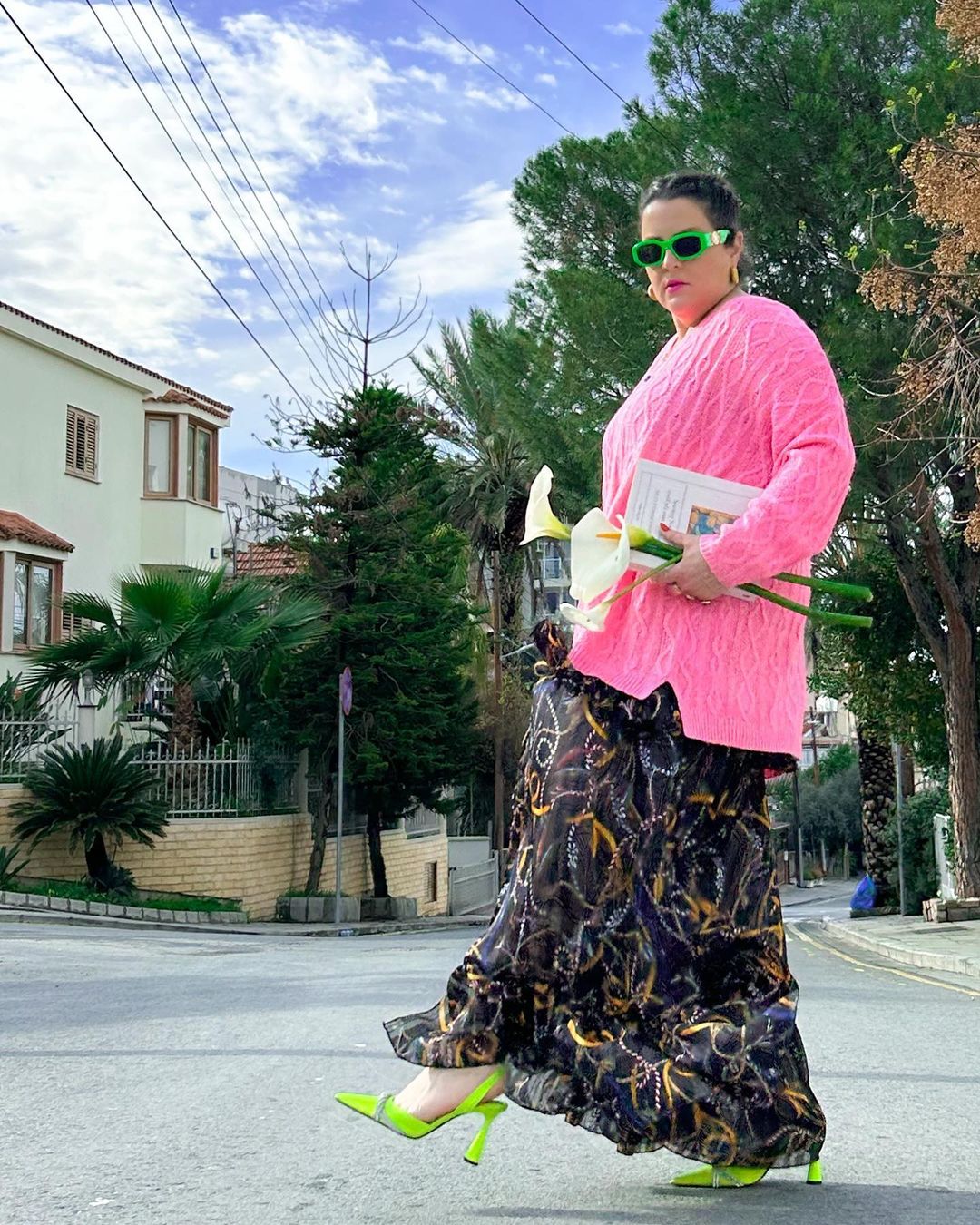 Ολοκλήρωσε την επίκαιρη εμφάνισή της με πράσινο neon pumps και statement γυαλιά ηλίου Versace σε πράσινο κιπαρισσί χρώμα.