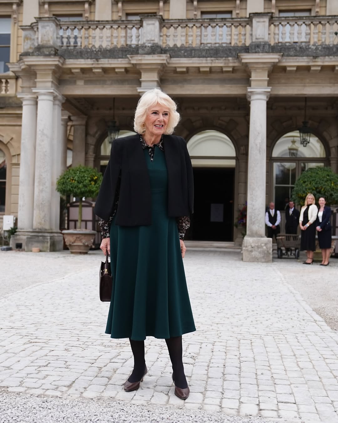 Για την εμφάνισή της, η βασίλισσα Καμίλα επέλεξε ένα βαθύ πράσινο midi φόρεμα της Fiona Clare Aldridge, το οποίο συνδύασε με μαύρη κάπα της Amanda Wakeley, ένα κομμάτι που ήδη θεωρείται big trend της σεζόν. Το look ολοκλήρωσαν οι καφέ γόβες, το σκούρο καλσόν και το ήπιο, χαρακτηριστικό μακιγιάζ της που χαρίζει πάντα μια διακριτική φινέτσα.