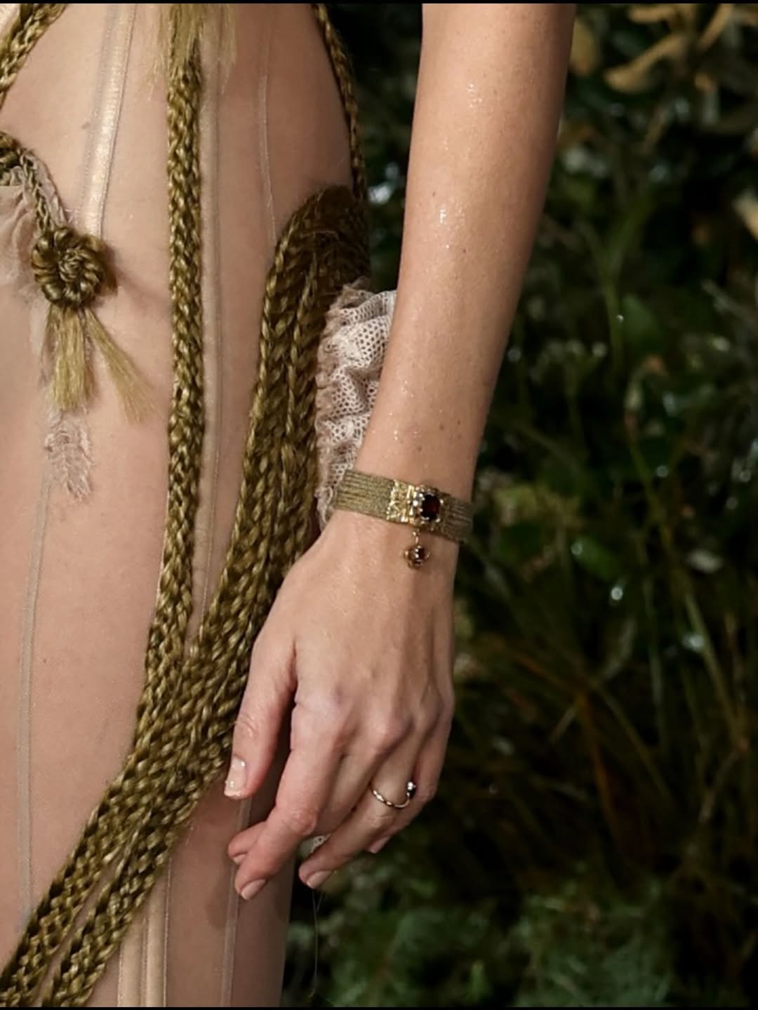 Το look ολοκληρώθηκε με ακόμη περισσότερες vintage πινελιές από τα αρχεία του Boucheron: μια καρφίτσα από κίτρινο χρυσό με κόκκινο γρανίτη από το 1900 και μια καρφίτσα του 1920 σε σχήμα κεφαλιού λιονταριού, με στόμα από ρουμπίνια και διαμαντένιες λεπτομέρειες. Η τελευταία πινελιά, σκουλαρίκια φτιαγμένα με γρανίτες, μαργαριτάρια και διαμάντια, καθώς και ένα δαχτυλίδι με ρουμπίνι, όλα από τη Jessica McCormack.