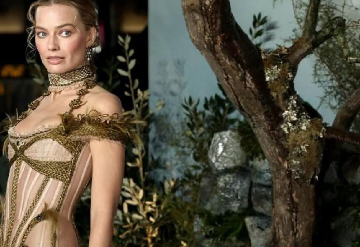 Για την πρεμιέρα στο Λονδίνο, ο Mukumal έντυσε τη Robbie με ένα custom, ημιδιάφανο nude φόρεμα της Dilara Fındıkoğlu. Η σχεδιάστρια, σταθερή συνεργάτιδα της ηθοποιού σε αυτή την περιοδεία, είχε υπογράψει και προηγούμενες εμφανίσεις της, όπως ένα κόκκινο snakeskin micro dress και ένα σύνολο με κορσέ και τζιν. Αυτή τη φορά, το φόρεμα ήταν καλυμμένο με πλεξούδες, δημιουργώντας μια σκοτεινή, δραματική αισθητική που ταίριαζε απόλυτα με το ιδιαίτερο βραχιόλι.