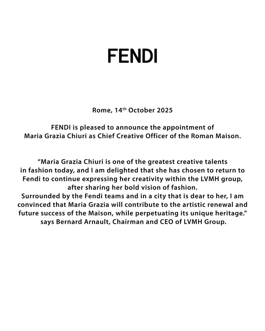 Από την πλευρά του, ο Ramon Ros, πρόεδρος και διευθύνων σύμβουλος του οίκου, δήλωσε: «Ο ρόλος ενός δημιουργικού διευθυντή δεν είναι πλέον απλώς να σχεδιάζει ρούχα, αλλά να επιμελείται μια κουλτούρα και να κρατά έναν καθρέφτη στον κόσμο στον οποίο ζούμε. Με τη Maria Grazia, είμαστε σίγουροι ότι ο Fendi θα εισέλθει σε μια νέα εποχή δημιουργικής καινοτομίας».