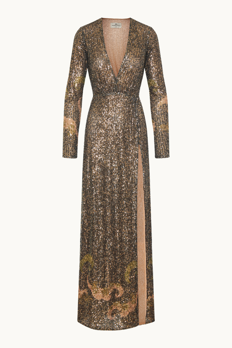 Το επίκεντρο της εμφάνισής της ήταν ένα εντυπωσιακό maxi φόρεμα με παγιέτες από το brand Nidodileda, αξίας μόλις €92. Σε αποχρώσεις μπρονζέ και χρυσού, με μακρύ μανίκι και διακριτικό σκίσιμο στο πλάι, το φόρεμα αποπνέει μια sophisticated λάμψη που δεν περνά απαρατήρητη.