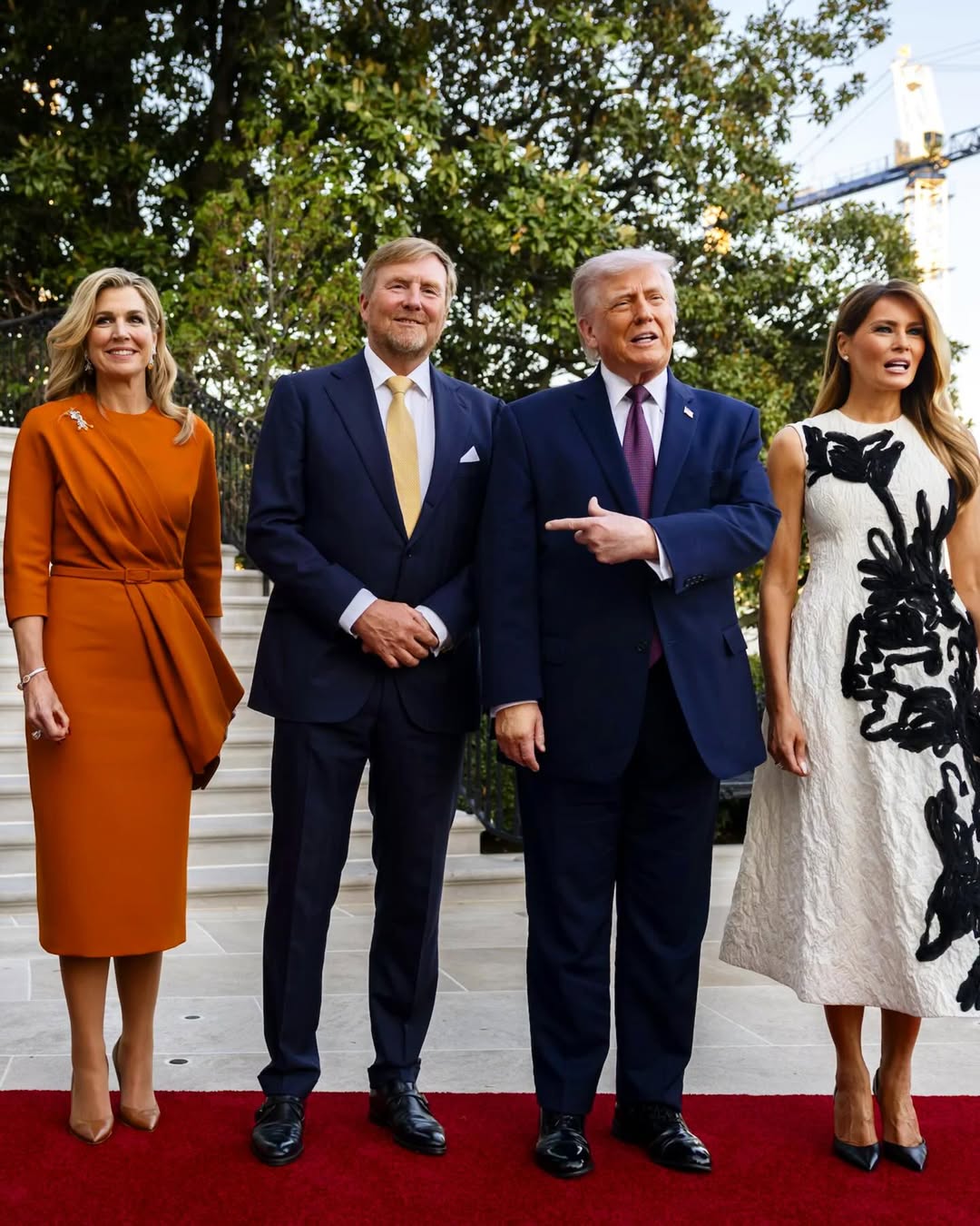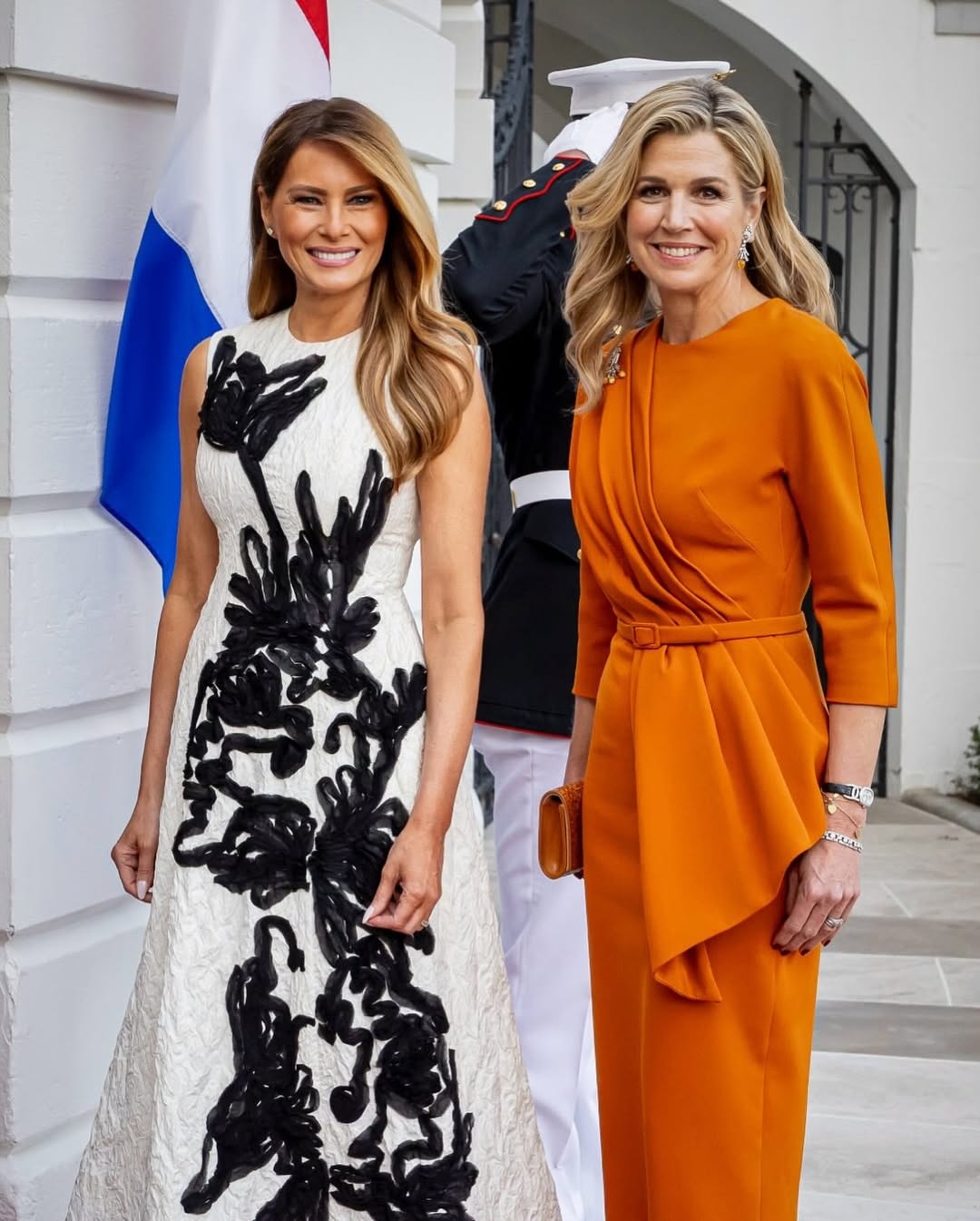 Την ίδια στιγμή, η Queen Máxima επέλεξε ένα εντελώς διαφορετικό ύφος, φορώντας ένα draped φόρεμα σε έντονο πορτοκαλί, αποδεικνύοντας για ακόμη μία φορά τη δυναμική και τολμηρή της προσέγγιση στο στυλ. Με μια εντυπωσιακή μαργαριταρένια καρφίτσα με ιστορία αιώνων, πρόσθεσε royal χαρακτήρα και έντονη προσωπικότητα στην εμφάνισή της, λειτουργώντας, ουσιαστικά, ως το τέλειο fashion contrast δίπλα στη Melania.