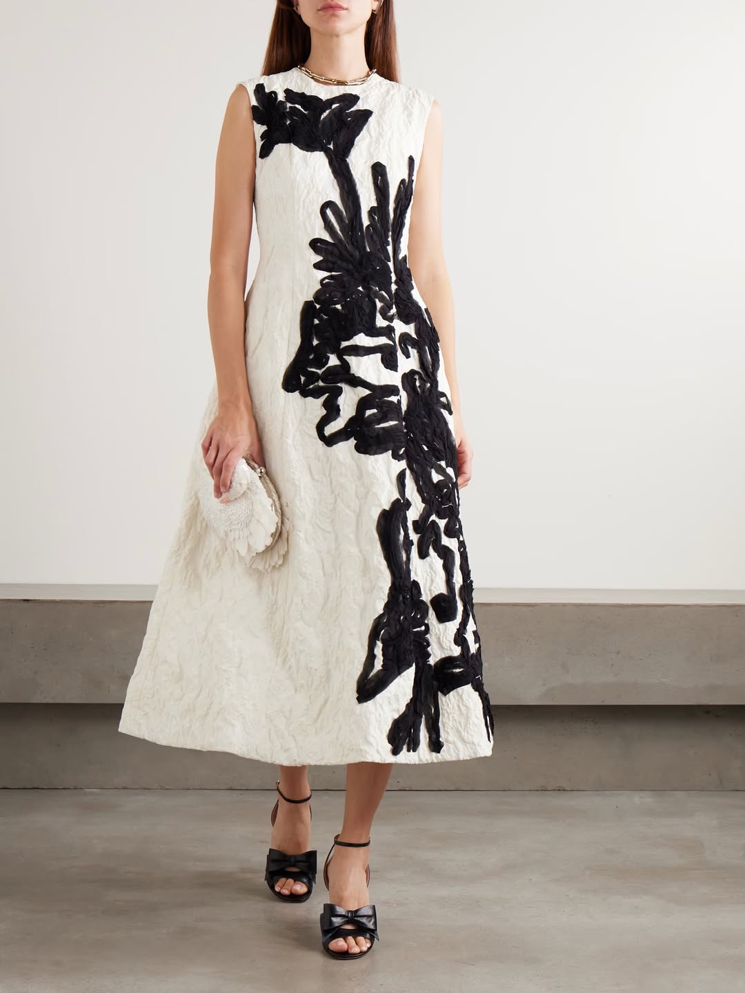 Για τη σημαντική αυτή διπλωματική περίσταση, η Πρώτη Κυρία επέλεξε ένα λευκό midi φόρεμα από τον οίκο Erdem, το οποίο ξεχώριζε για τα έντονα μαύρα floral appliqué και την τρισδιάστατη, σχεδόν γλυπτική υφή του. Ένα σύνολο που ισορροπούσε ανάμεσα στη μινιμαλιστική κομψότητα και το statement dressing, ιδανικό για το αυστηρό πλαίσιο της ημέρας. Το συνδύασε με μαύρες pointy γόβες ενώ φορούσε ένα ζευγάρι διαμαντένια σκουλαρίκια.