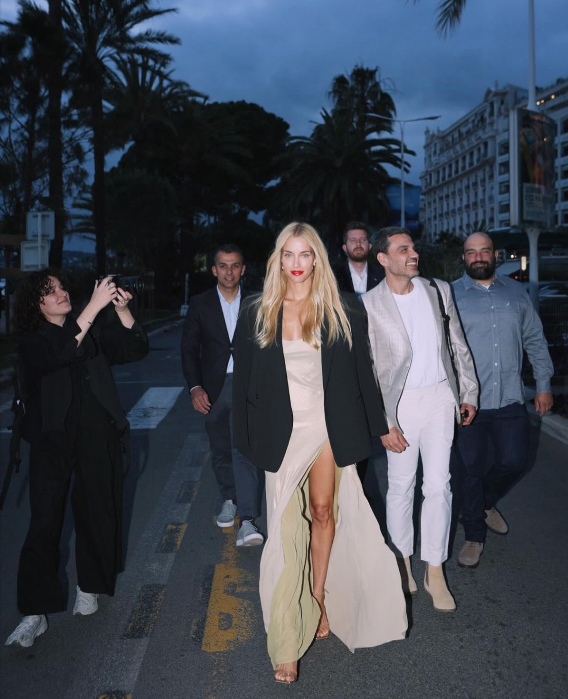 Από πλευράς της, η όμορφη παρουσιάστρια, για την την πρώτη της εμφάνιση στην Κρουαζέτ επέλεξε να φορέσει ένα slit, side & thigh split dress σε χρυσή απόχρωση, το οποίο συνδύασε με ένα oversized μαύρο blazer jacket και ολοκλήρωσε την εμφάνισή της με ψηλοτάκουνα πέδιλα με golden και PVC details, μαύρη δερμάτινη τσάντα και χρυσά κοσμήματα, ενώ τόνισε τα χείλη της με κόκκινο κραγιόν. Την επόμενη ημέρα της παραμονής της στις Κάννες, για το κόκκινο χαλί επένδυσε υπέροχη και αποκαλυπτική μαύρη μάξι δημιουργία με cut outs της Σίλιας Κριθαριώτη.