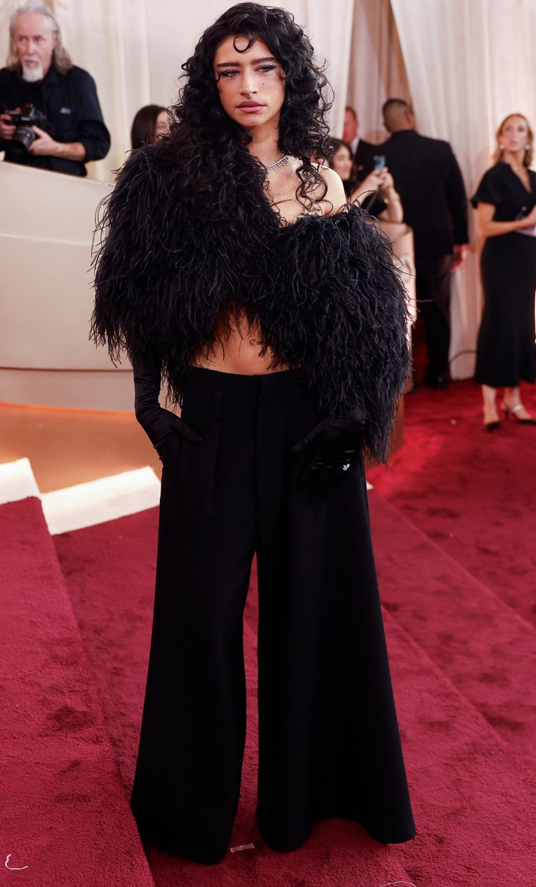 Παράλληλα, η Odessa A’zion εμφανίστηκε με tailored παντελόνι με φτερά, επιλέγοντας συνειδητά να απομακρυνθεί από την κλασική εικόνα της βραδινής τουαλέτας.