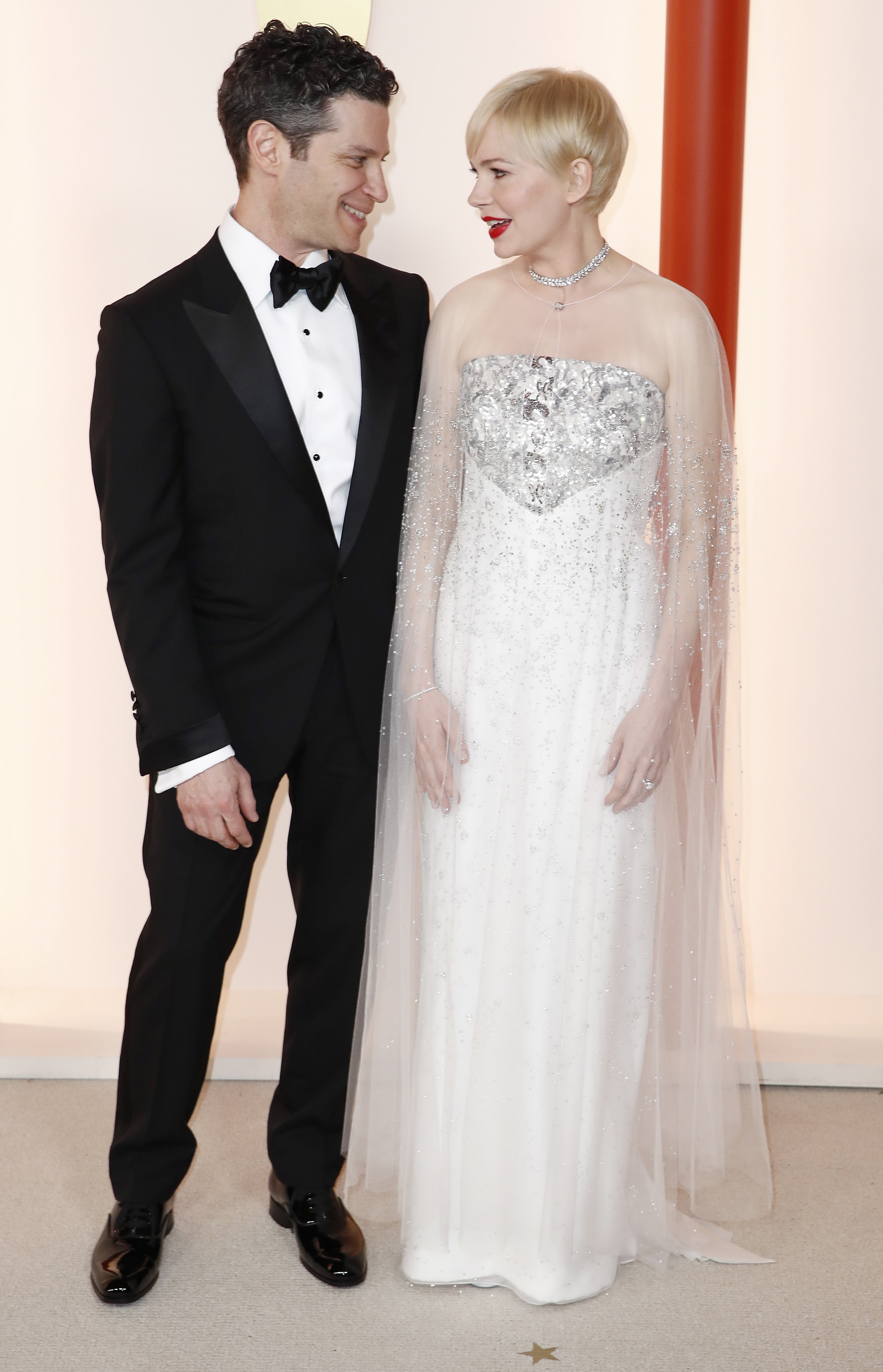 Φτάνοντας στο σαμπανιζέ χαλί μαζί με τον Michelle Williams, η Michelle Williams εντυπωσίασε φορώντας ένα λευκό Chanel μάξι φόρεμα με ασημί λεπτομέρειες στο μπούστο.