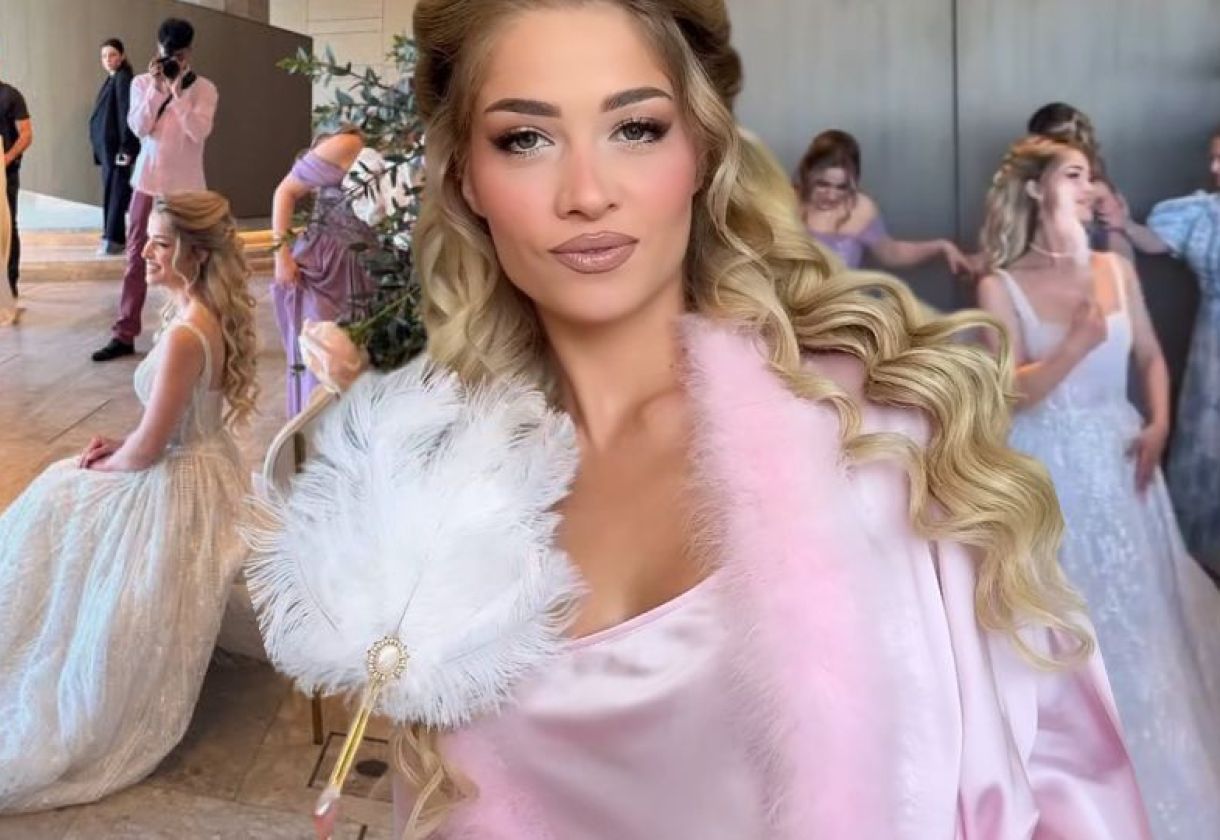 Για να ισορροπήσει την ένταση του φορέματος, το beauty look κινήθηκε πιο soft. Τα μαλλιά ήταν σε χαλαρούς, glossy κυματισμούς, με όγκο αλλά χωρίς υπερβολές. Το μακιγιάζ παρέμεινε σε φωτεινές nude και ροζ αποχρώσεις, με λάμψη στην επιδερμίδα και διακριτικό glow, αφήνοντας το νυφικό να πρωταγωνιστεί.