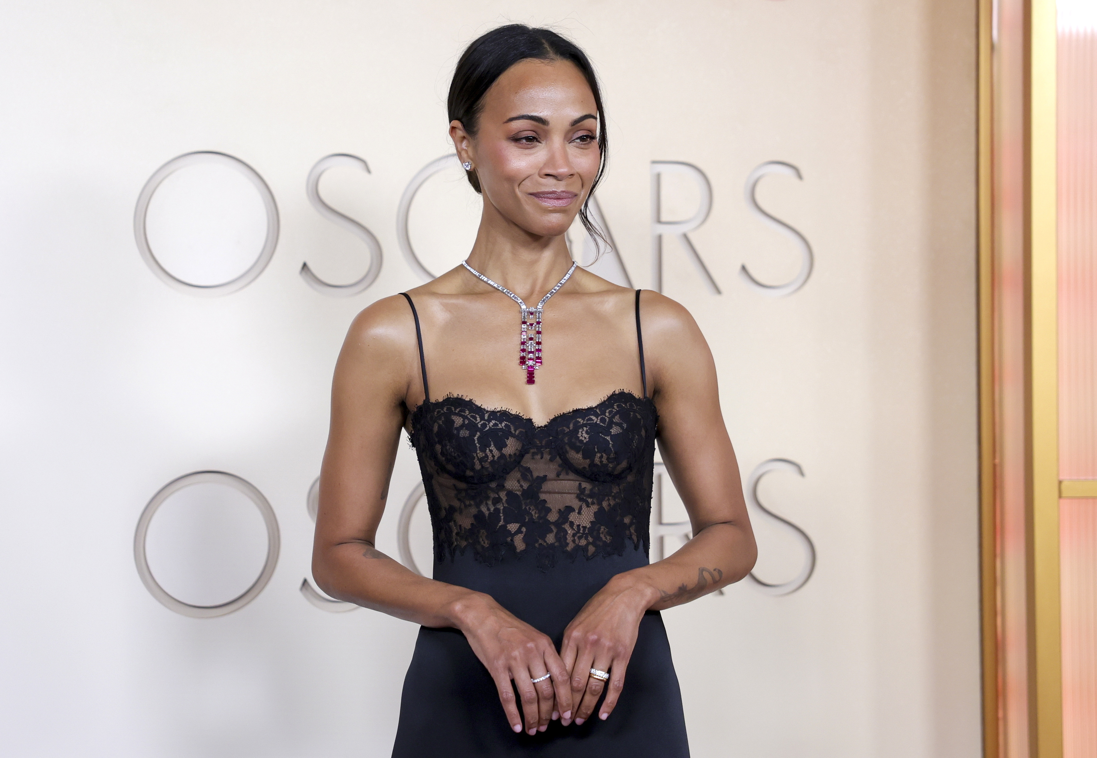 Η Zoe Saldaña επέλεξε ένα εντυπωσιακό κολιέ υψηλής κοσμηματοποιίας από τον ιστορικό οίκο Cartier. Το κόσμημα, κατασκευασμένο από πλατίνα και διακοσμημένο με ρουμπίνια και διαμάντια, παρέπεμπε στην κομψότητα της art deco αισθητικής, ενώ συνδυάστηκε ιδανικά με το mini φόρεμά της από τον οίκο Saint Laurent.
