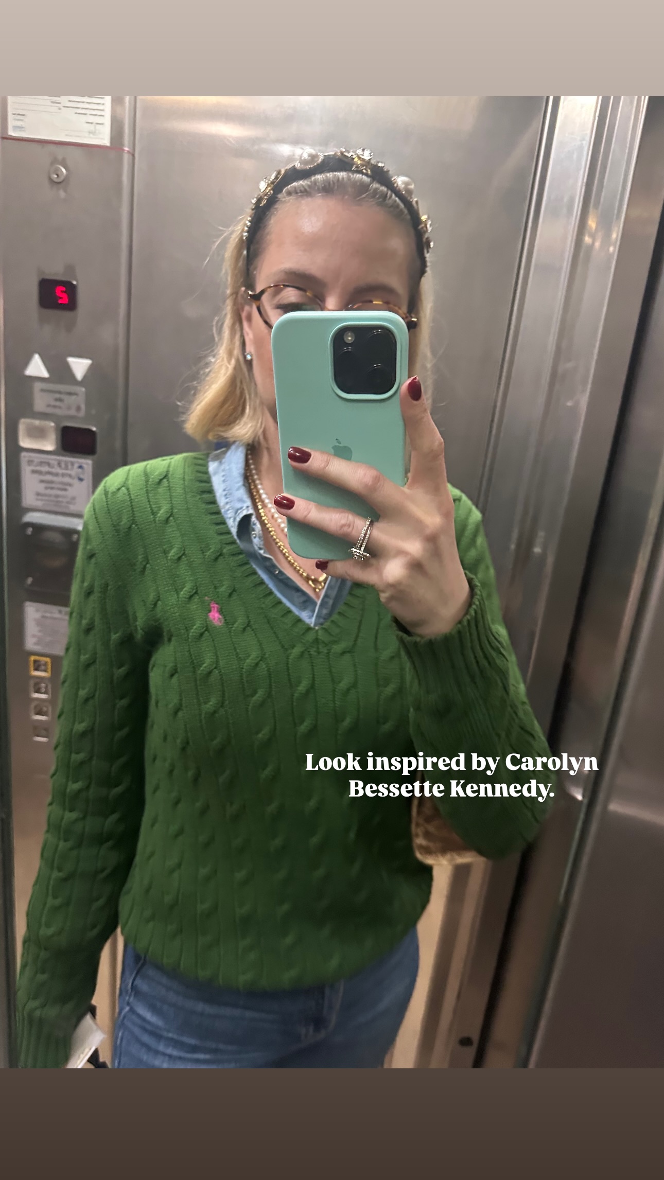Στο πρώτο look, η Σόλια υιοθετεί την πιο χαλαρή, καθημερινή πλευρά της Bessette. Φορά denim πουκάμισο, ένα κομμάτι-κλειδί της 90s γκαρνταρόμπας, το οποίο συνδυάζει με πράσινο πλεκτό layered από πάνω και τζιν από κάτω. Το denim δίνει ανεπιτήδευτη αίσθηση, ενώ το πλεκτό προσθέτει βάθος και υφή. Πρόκειται για εκείνο το είδος layering που δείχνει αβίαστο, αλλά στην πραγματικότητα βασίζεται στην ισορροπία των τόνων και των υφασμάτων.