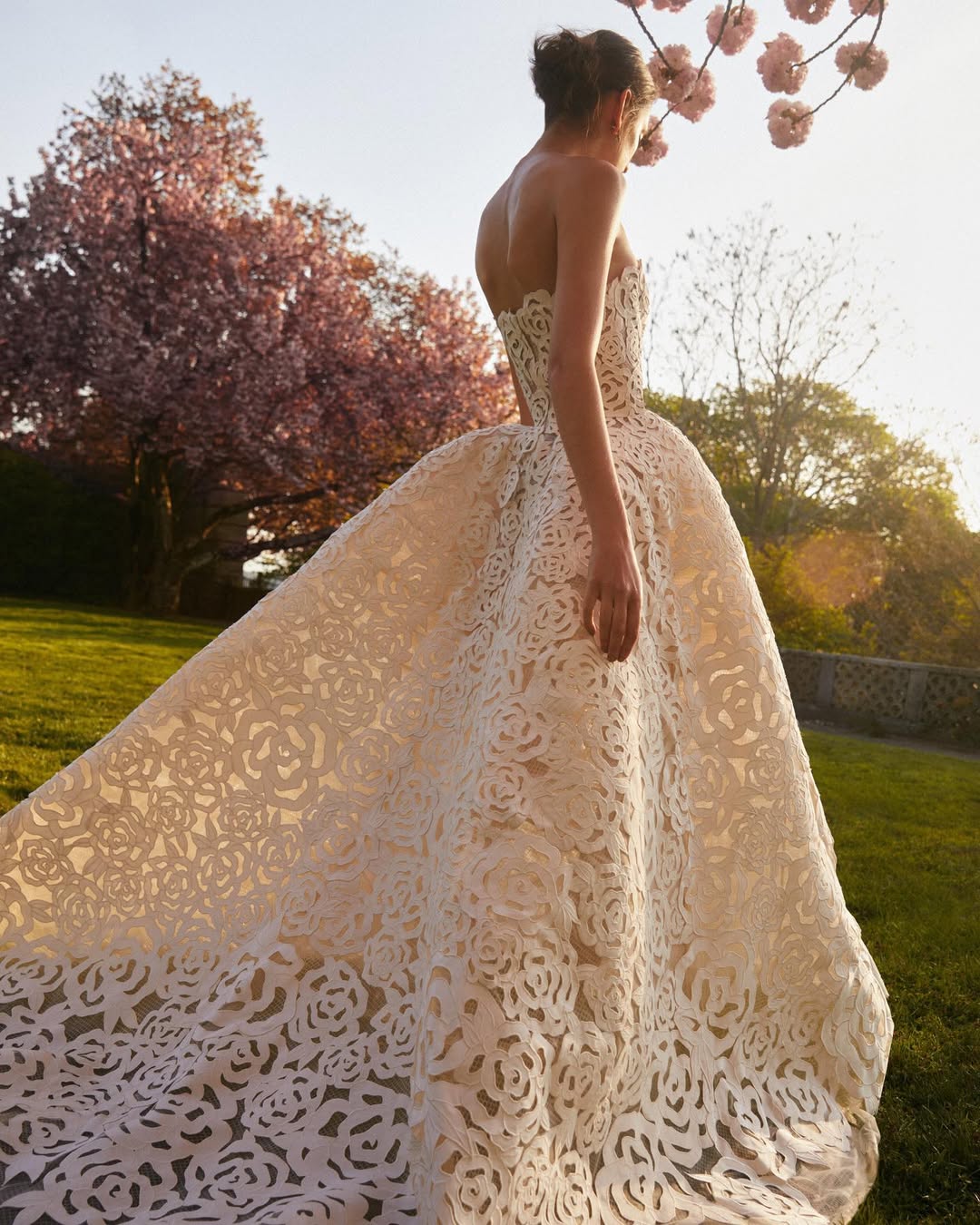 Το Oscar de la Renta Spring 2024 “Rosette” ball gown, με τα εντυπωσιακά laser-cut κεντημένα τριαντάφυλλα, είχε αρχική τιμή περίπου 20.000 δολάρια, ενώ στη μεταχειρισμένη αγορά, ένα νυφικό της ίδιας συλλογής εμφανίζεται σε αγγελίες γύρω στα 11.560 δολάρια.