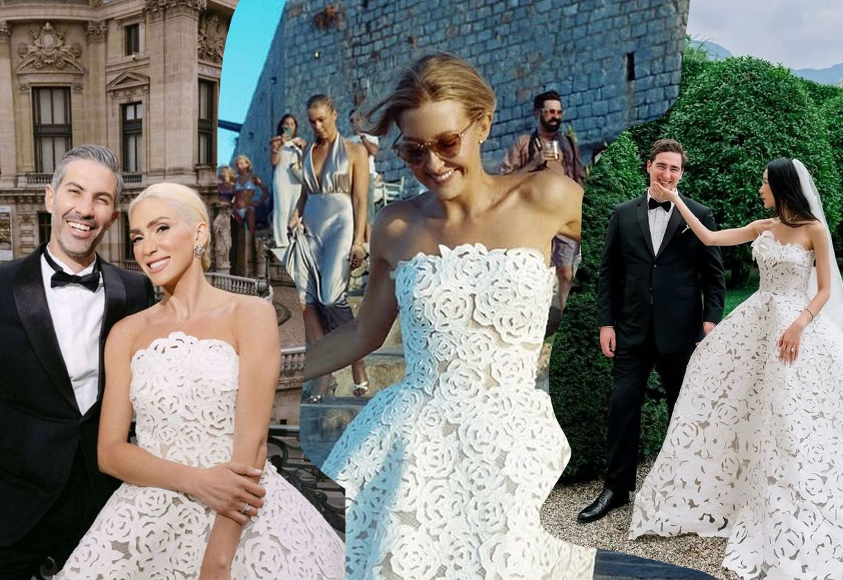 Και ενώ ένα τόσο ιδιαίτερο νυφικό θα περίμενε κανείς να εμφανιστεί μία φορά, μέχρι σήμερα το έχουμε δει σε τρεις ξεχωριστές νύφες, σε τρία εντελώς διαφορετικά σκηνικά, από το Παρίσι στη λίμνη Κόμο μέχρι το Αιγαίο.