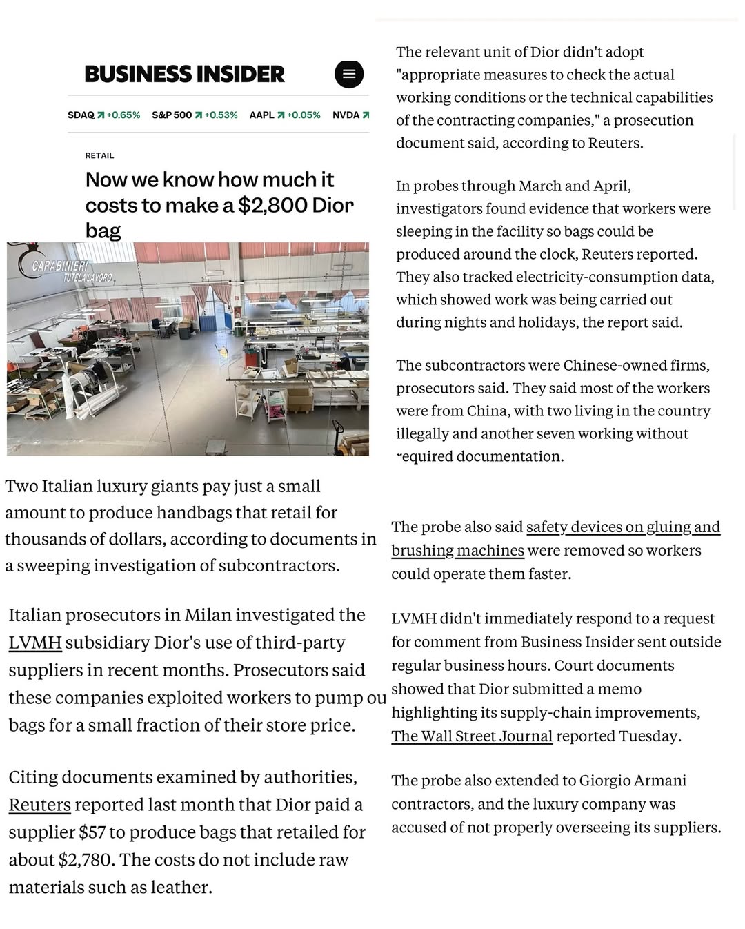 Η έρευνα της ιταλικής αστυνομίας αποκάλυψε πως δύο εταιρείες, Pelletteria Elisabetta Yang SRL και Davide Albertario Milano SRL, παρήγαγαν δερμάτινα είδη για τη Dior. Οι αποκαλύψεις σοκάρουν αφού εργάτες αναγκάζονταν να κοιμούνται μέσα στα εργοστάσια, ώστε να είναι διαθέσιμοι όλο το 24ωρο. Η κατανάλωση ρεύματος έδειχνε αδιάκοπη παραγωγή μέρα-νύχτα, ακόμη και αργίες και οι μηχανές είχαν απενεργοποιημένα συστήματα ασφαλείας για ταχύτερη παραγωγή. Μάλιστα, πολλοί εργαζόμενοι δεν είχαν νόμιμα έγγραφα και δεν πληρώνονταν κανονικά.