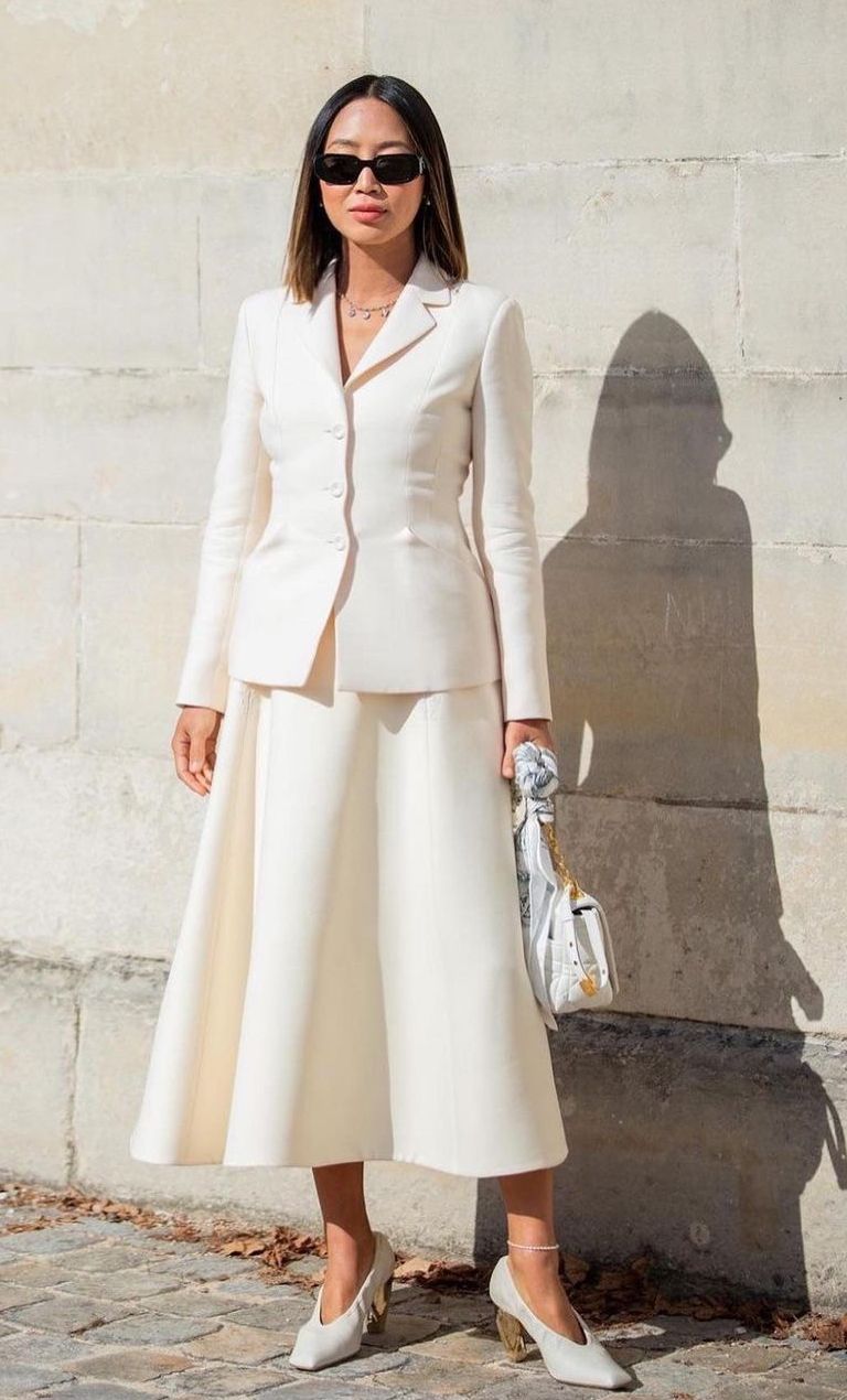 Αν και στο Instagram υπάρχουν εκατοντάδες αν όχι περισσότερες influencers που εντυπωσιάζουν με τις αναρτήσεις τους και εμπνέουν στυλιστικά γυναίκες από όλο τον πλανήτη, αναφβίβολα η Aimee Song ξεχωρίζει. Η διάσημη blogger επίλεξε να φορέσει πρόσφατα μια Dior μίντι of white φούστα με ταιριαστό σακάκι και λευκές γόβες με χρυσά τακούνια και μάς "έπεισε" να αντιγράψουμε την εμφάνισή της ώστε να πετύχουμε και εμείς ένα όμορφο, αλλά διαφορετικό, office look. Η Aimee Song ολοκλήρωσε το σύνολό της με λευκή Dior τσάντα, μαύρα γυαλιά ηλίου και μίνιμαλ αξεσουάρ.